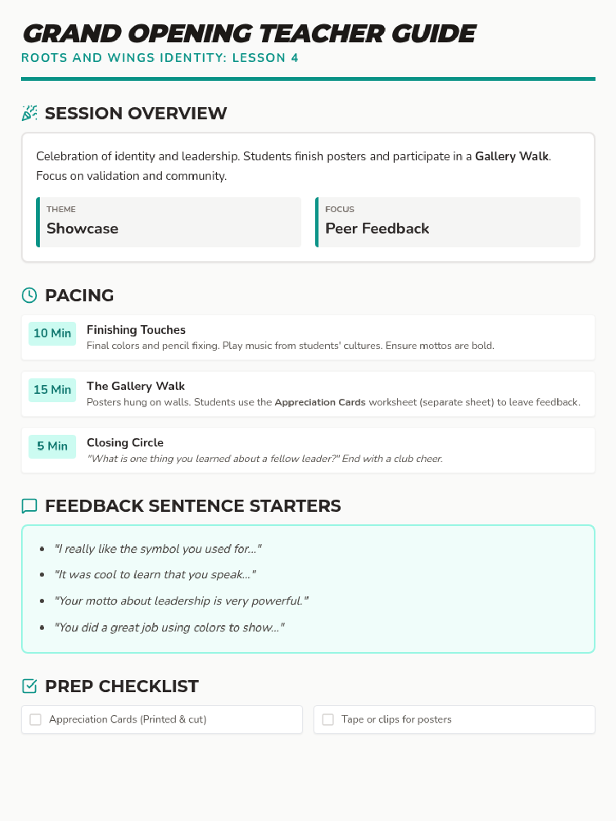 A guide for the final celebration and gallery walk, including instructions for positive peer feedback and reflection.