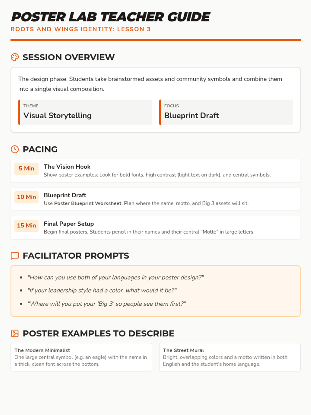 A guide for the design phase of the poster project, helping students synthesize their assets and symbols into a visual layout.