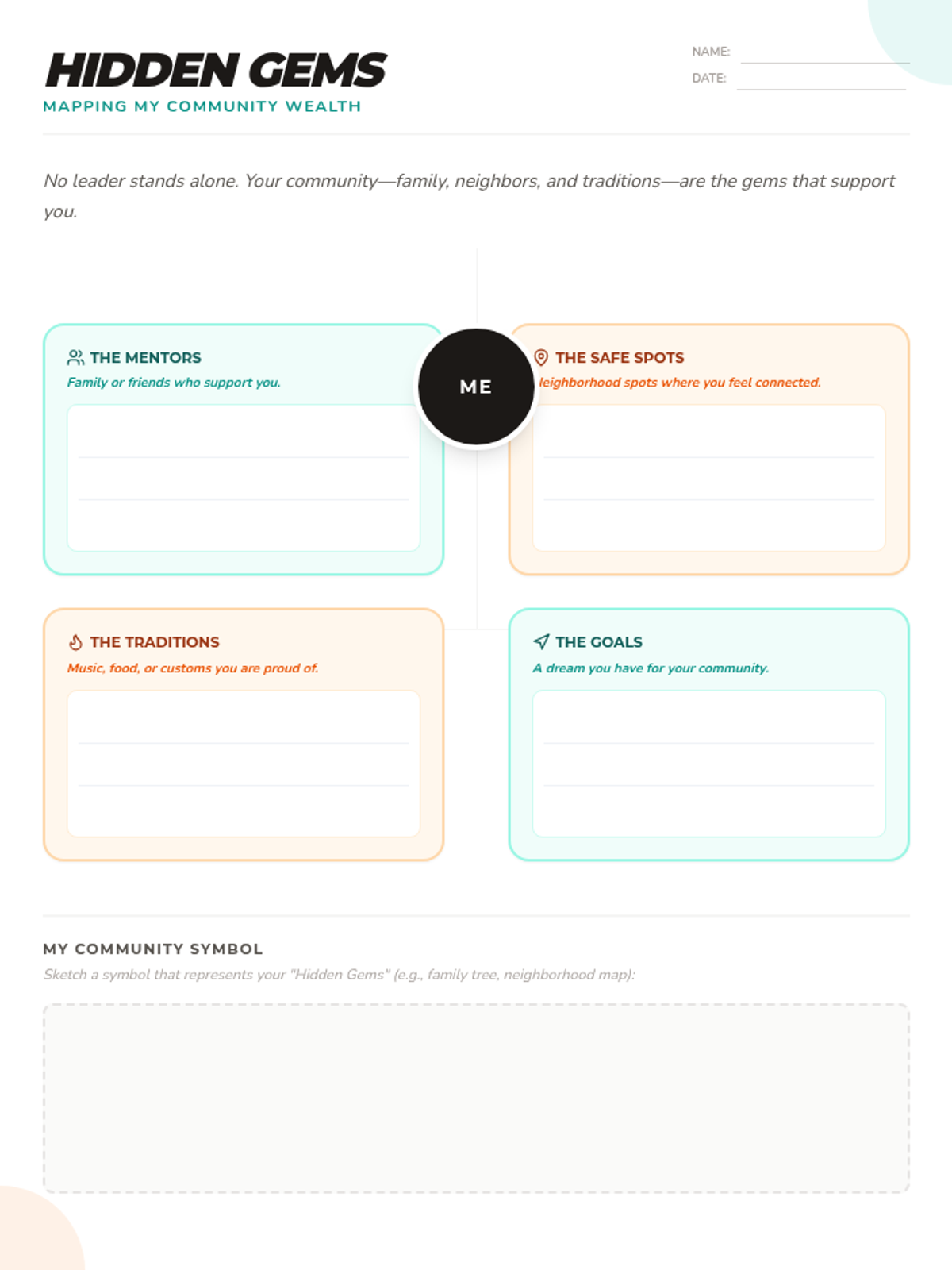 A visual map for students to identify the mentors, places, and traditions that contribute to their personal cultural wealth.