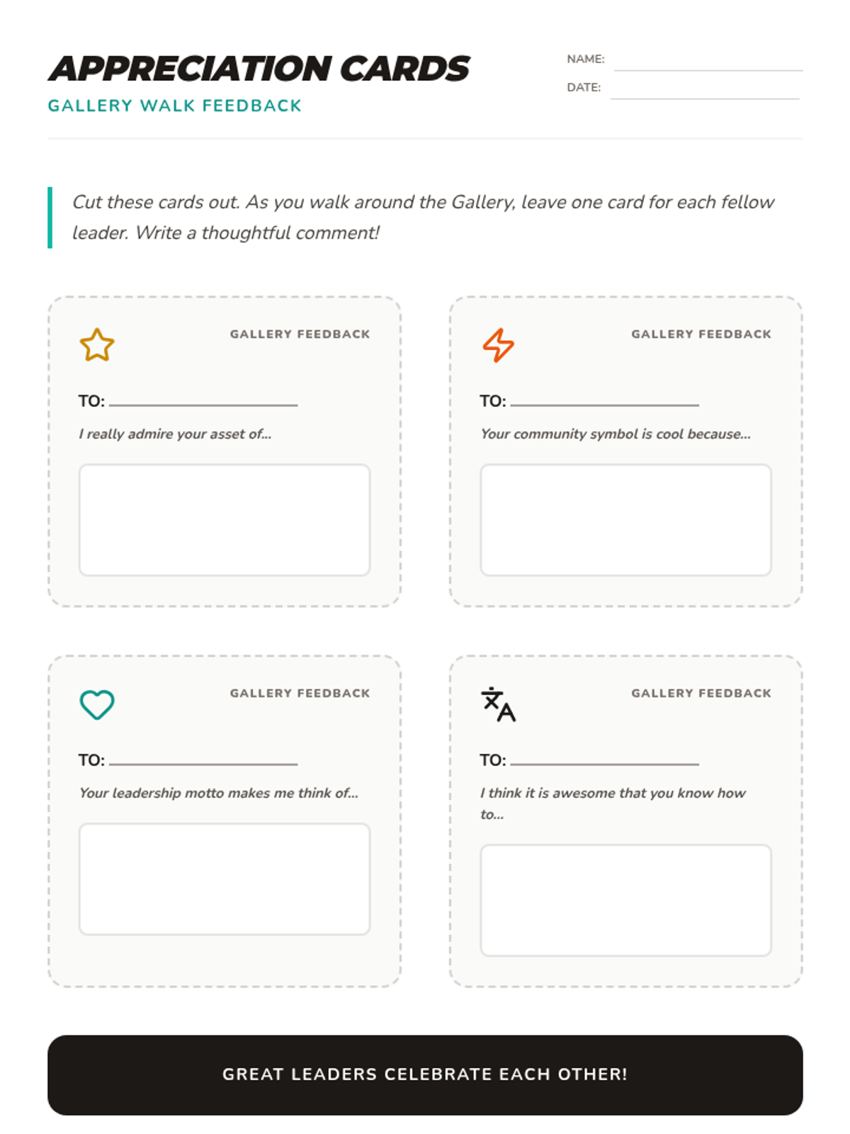 A set of printable feedback cards for students to use during the Gallery Walk to celebrate their peers' work.