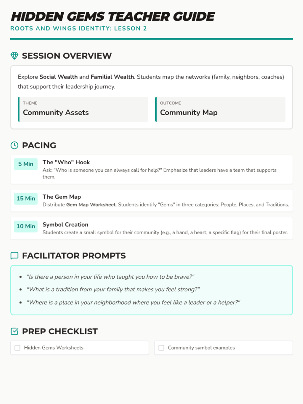 A facilitation guide for the second meeting of the club, focusing on social and familial wealth within the students' communities.