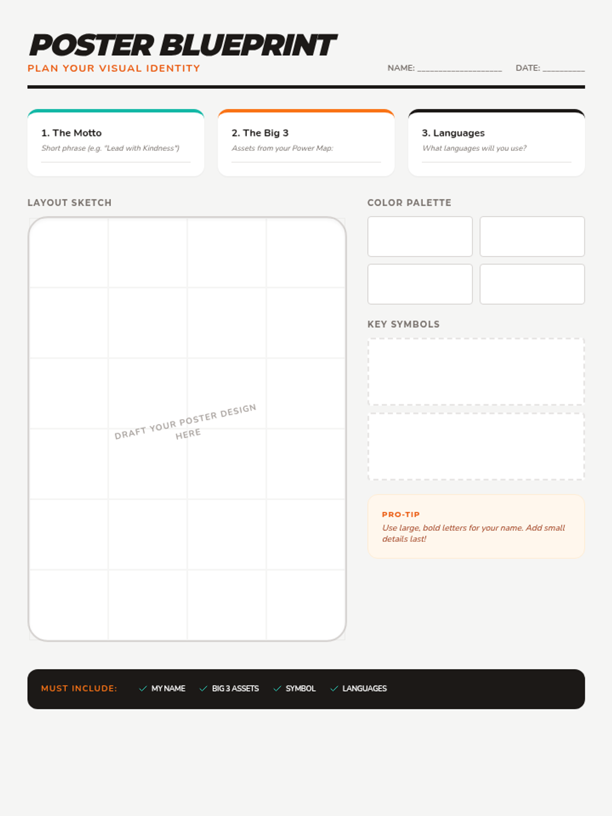 A planning sheet for students to draft the layout, color palette, and symbols for their final visual identity poster.