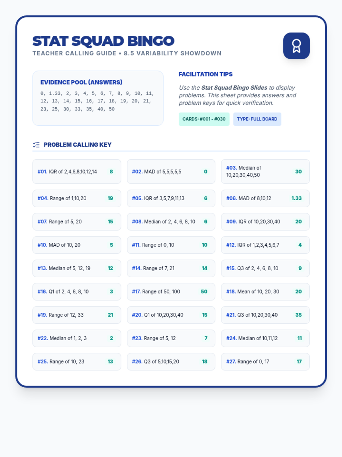 Teacher Calling Sheet for Stat Squad Bingo. Features a complete answer key for Case #01 through #27, facilitation tips, and an Evidence Pool reference.