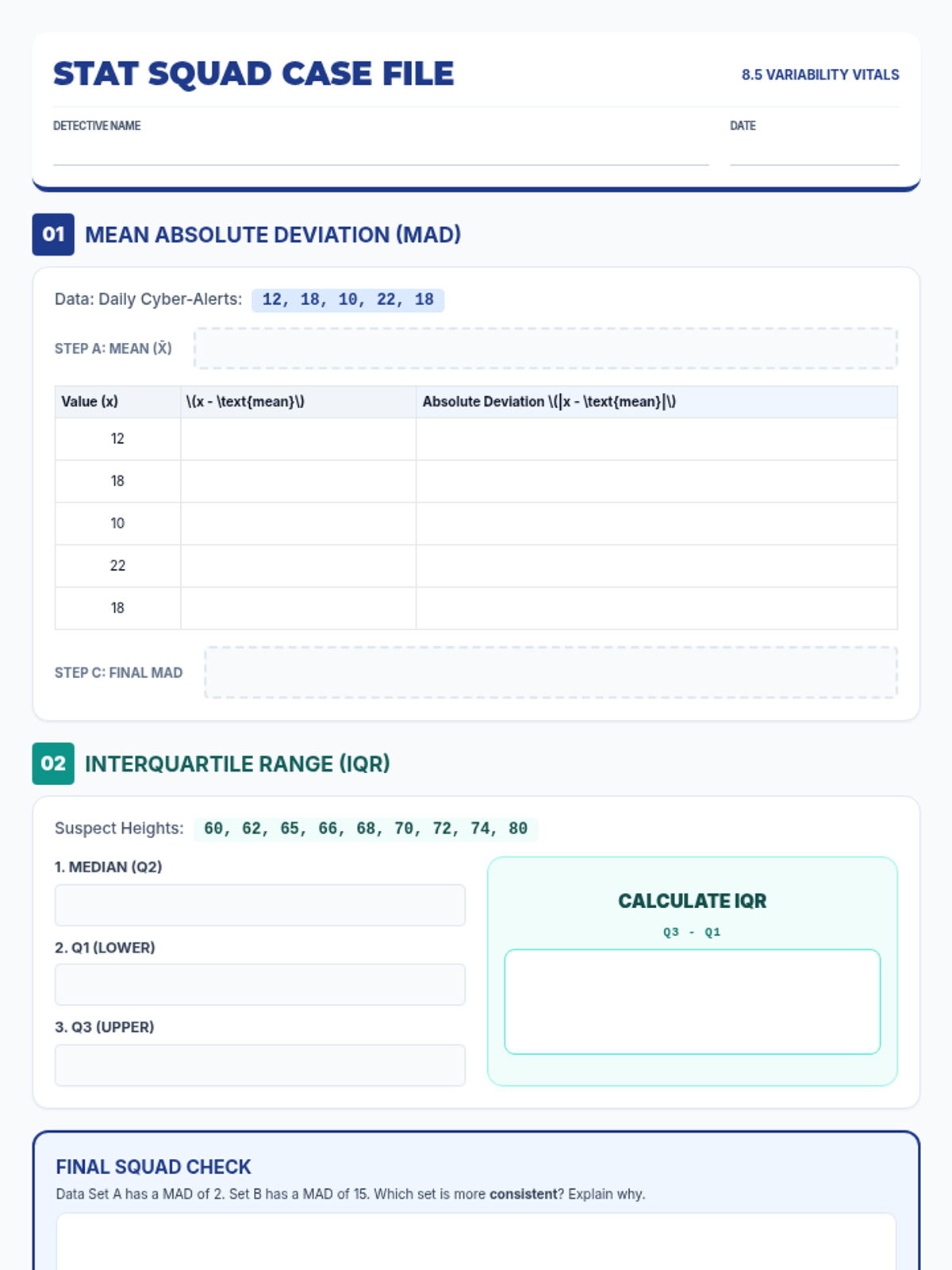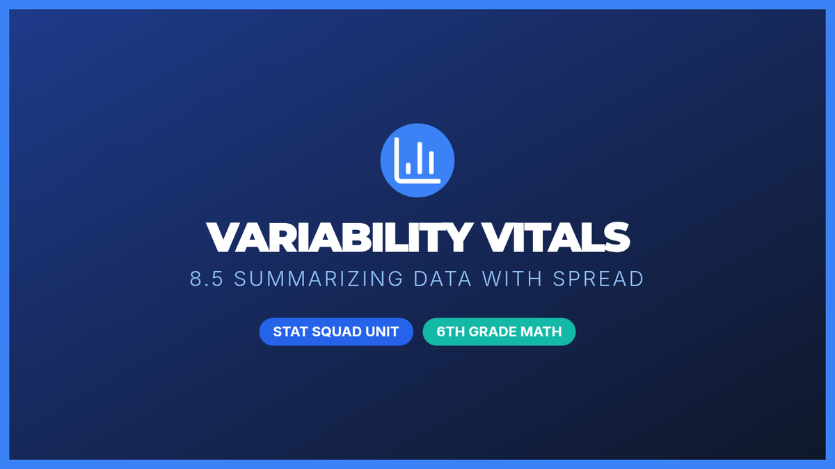 Updated slide deck for Variability Vitals, now including detailed step-by-step examples for Mean Absolute Deviation and Interquartile Range to facilitate teacher explanation.
