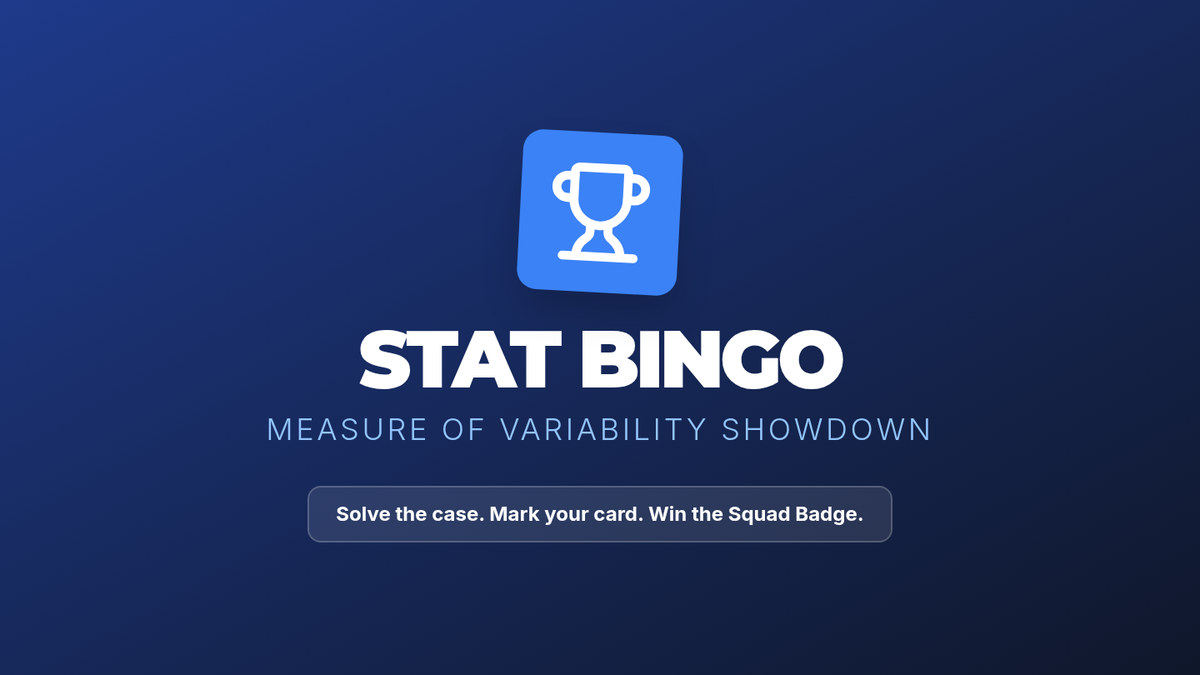 Bingo activity presentation for calling variability problems in class. Features large, readable data sets and distinct case numbers to match the teacher's calling guide. Includes step-by-step solution slides.