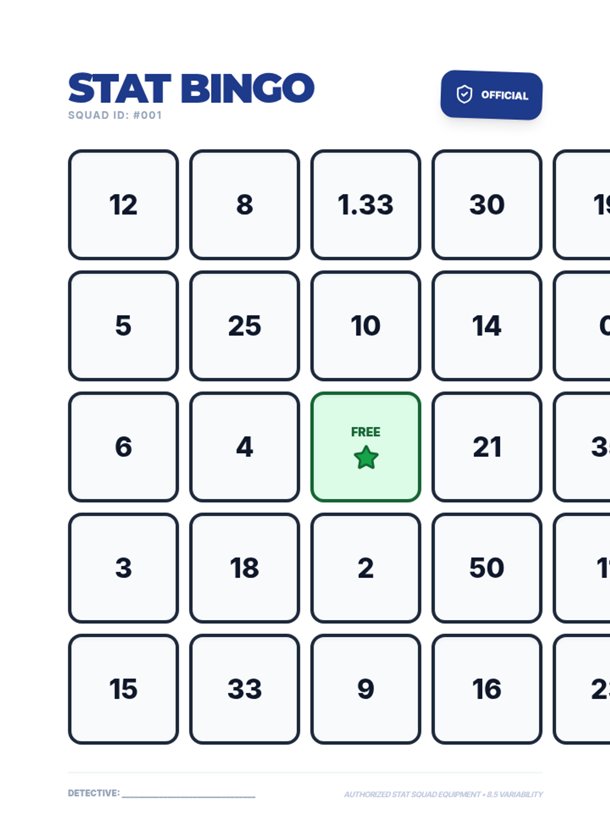 Set of unique, pre-filled randomized Bingo cards for the Stat Squad activity. Each card features 24 numbers from the evidence pool and a free space. Optimized for 8.5 x 11 printing. Card set IDs #001 to #030.