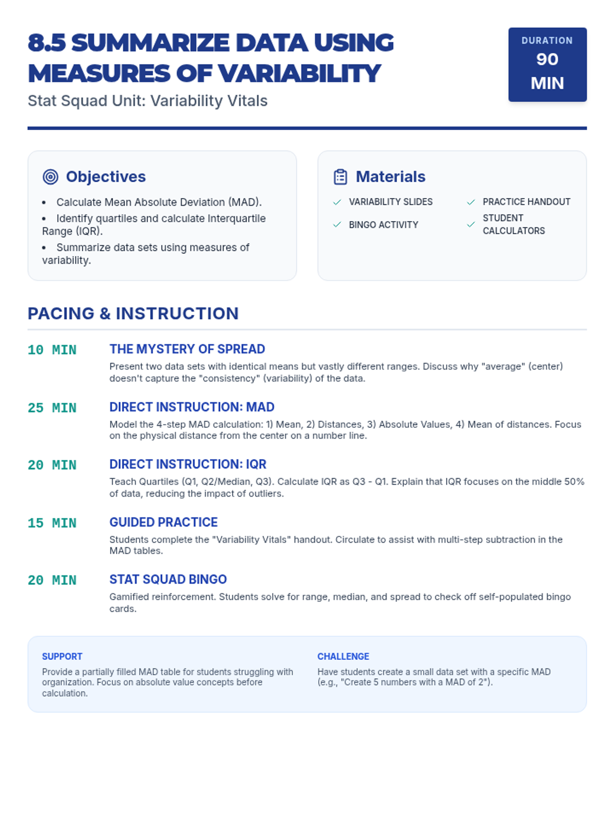 A detailed 90-minute lesson plan for 6th grade math covering Mean Absolute Deviation and Interquartile Range with a "Stat Squad" theme. Updated with requested title and single-page layout.