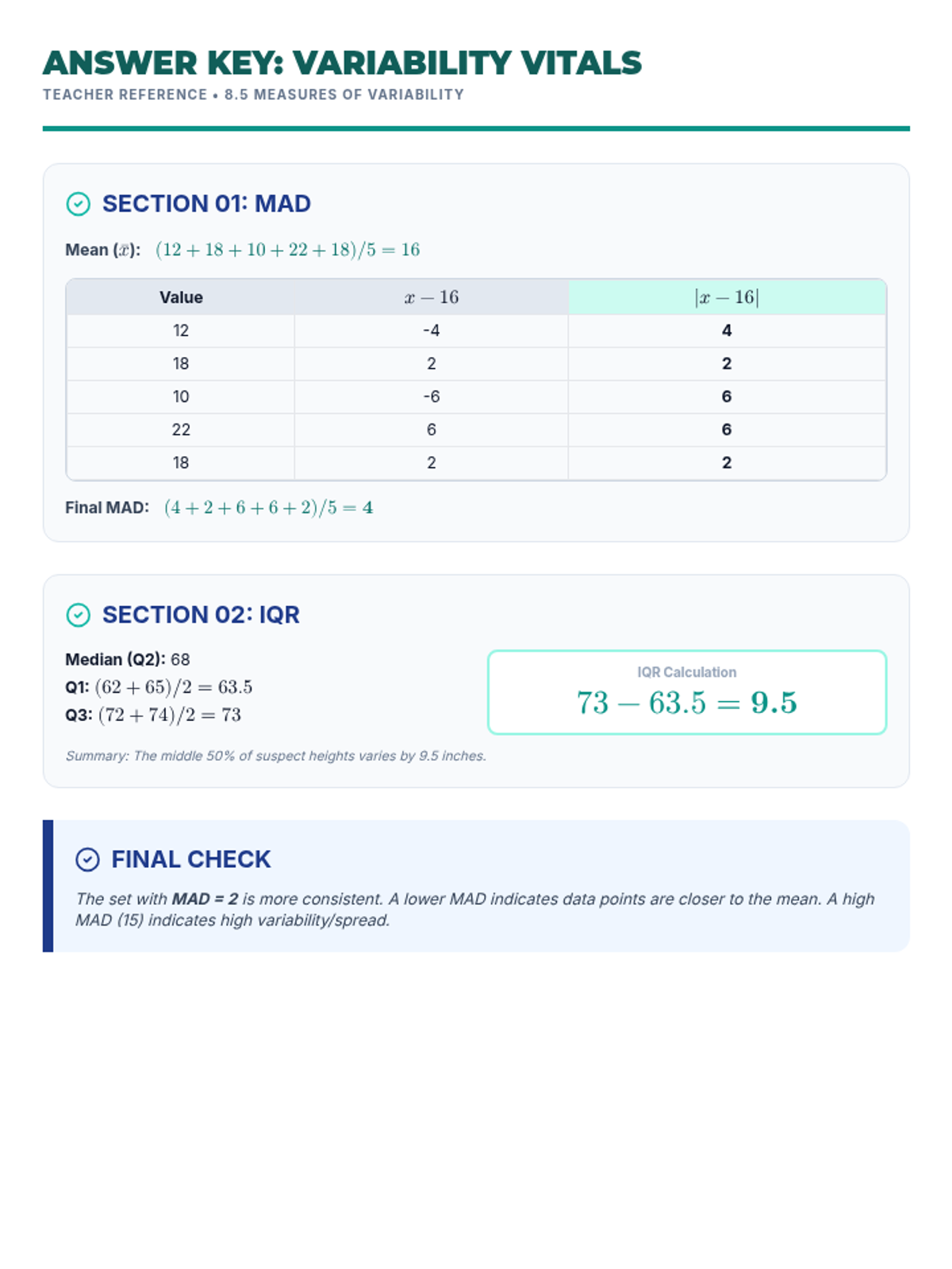 Teacher's answer key for the "Variability Vitals" worksheet, providing step-by-step solutions for MAD and IQR calculations. Optimized to fit on a single page.