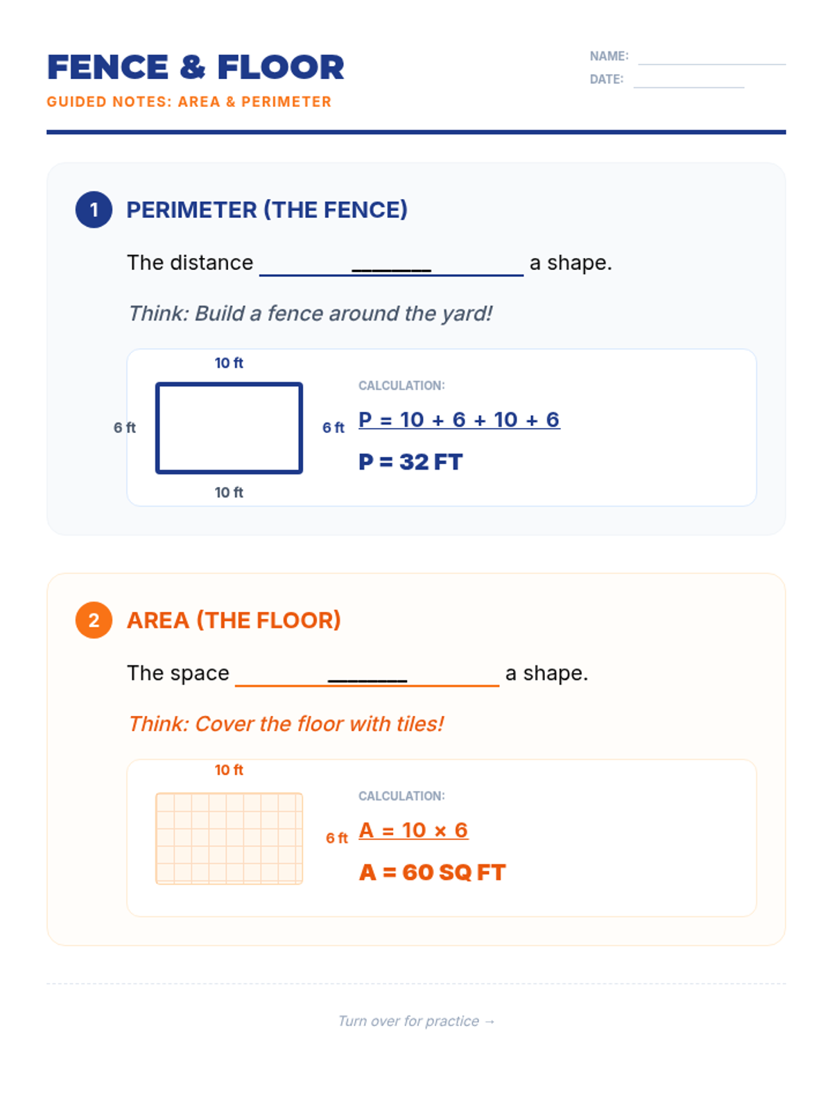 Guided notes and practice worksheet designed to accompany the Fence and Floor presentation. Includes fill-in-the-blank definitions, visual walkthroughs, and a variety of practice problems for calculating area and perimeter.