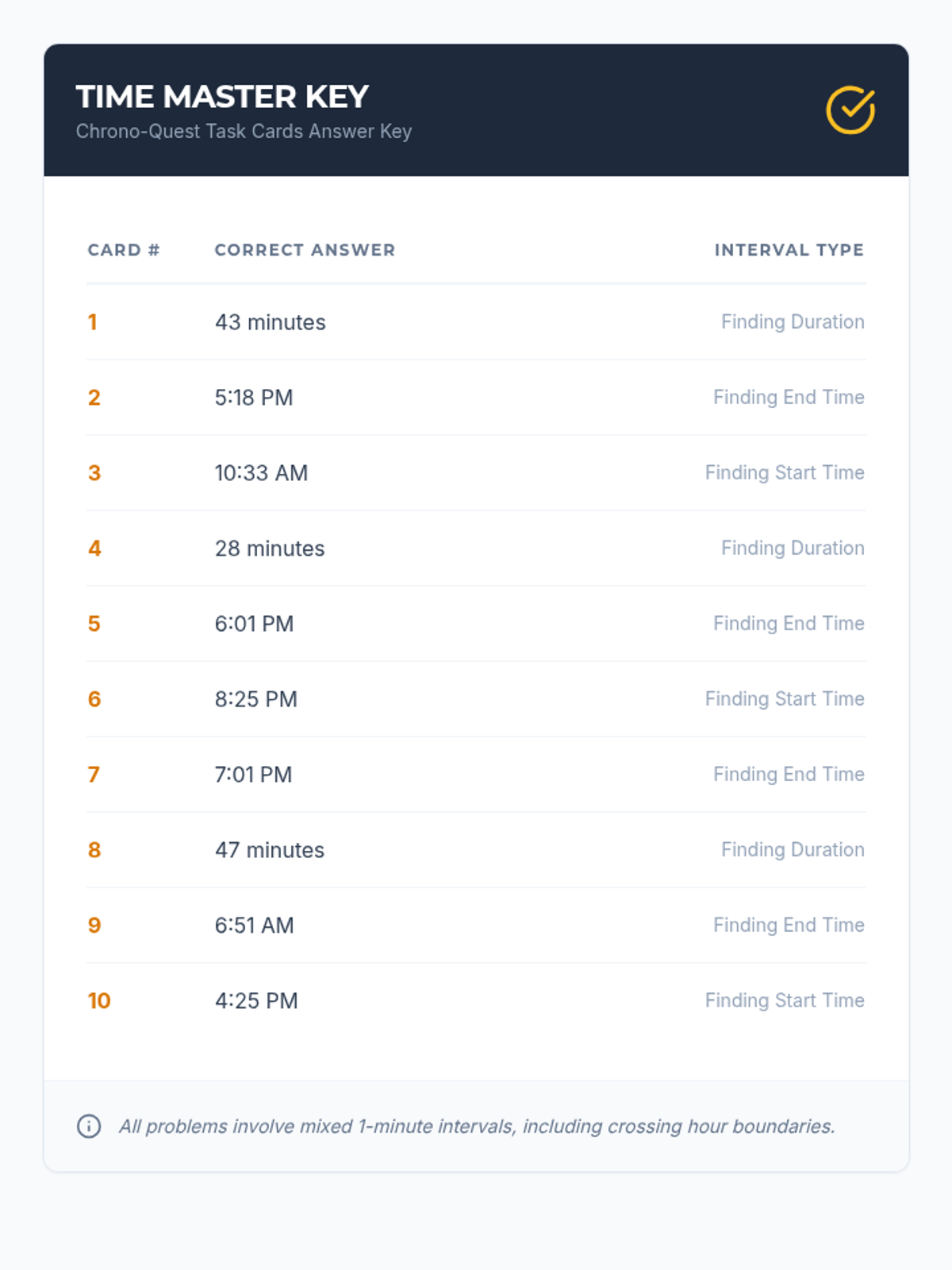 A teacher's answer key for the 'Time Traveler Task Cards' elapsed time word problems.