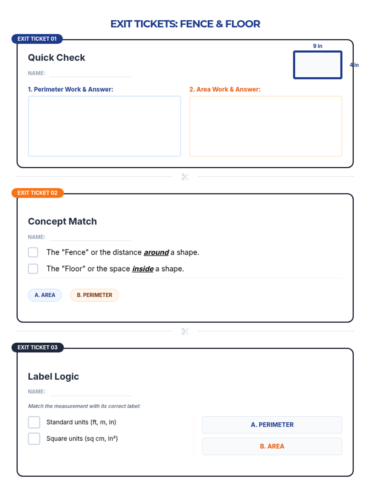 A set of three differentiated exit tickets for assessing understanding of area and perimeter. Includes a visual calculation check, a conceptual matching task, and a measurement label assessment.