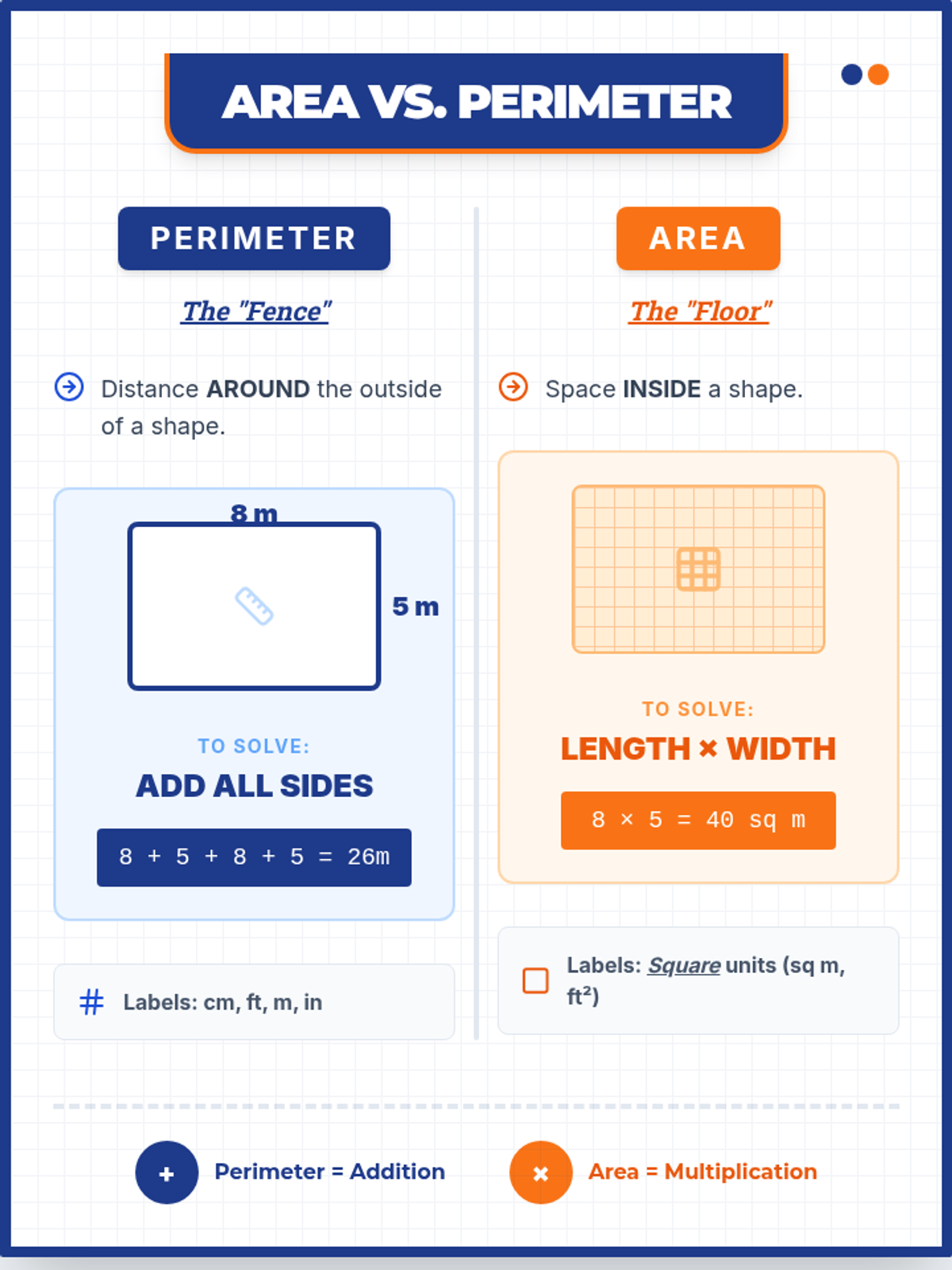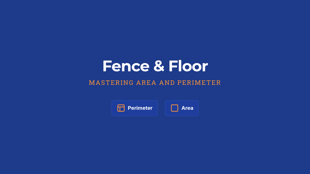 A high-impact slide deck introducing area and perimeter using the 'Fence and Floor' builder analogy. Features clear visual comparisons, formulas, and guided practice examples.