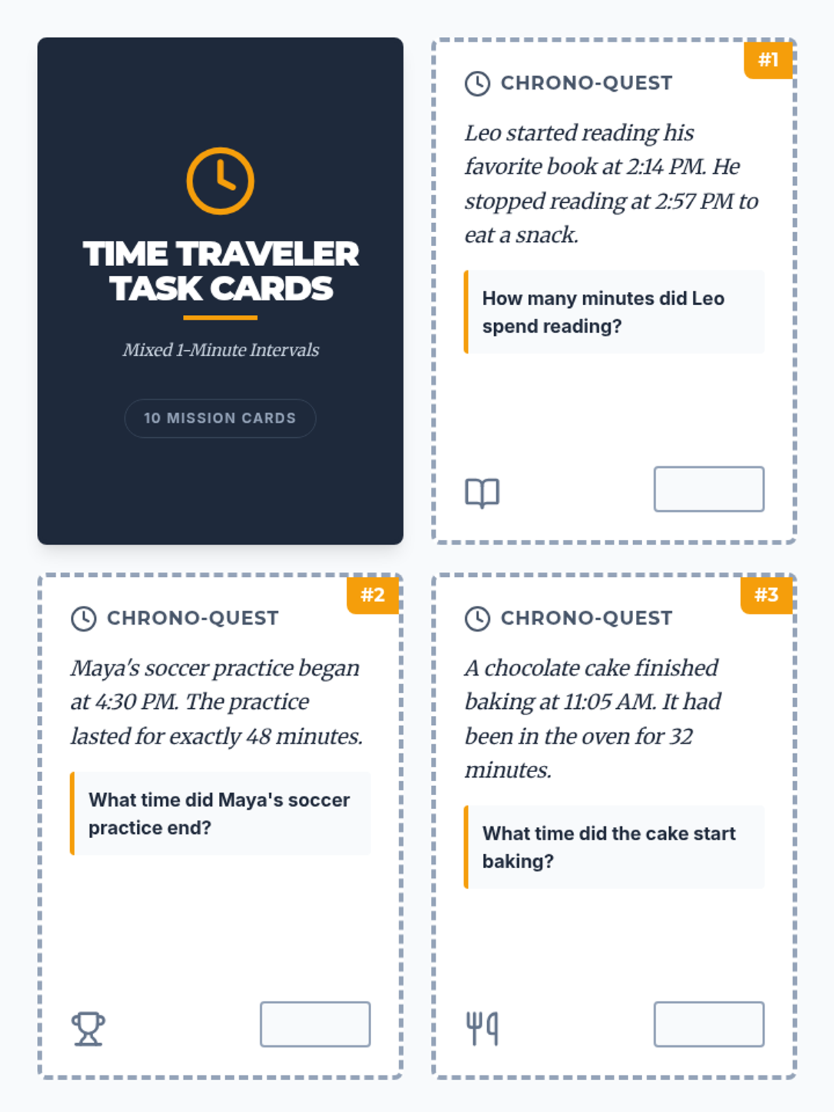 A set of 10 printable task cards featuring elapsed time word problems with mixed 1-minute intervals, designed with a fun 'Time Travel' theme. Includes corrected contrast and enlarged result areas.