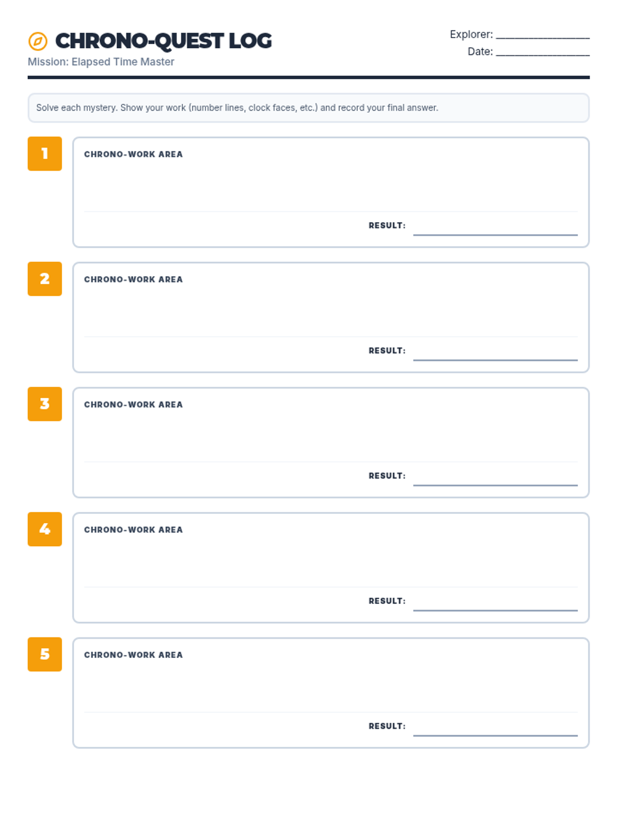 A printable recording sheet for students to show their work and write their answers for the 10 elapsed time task cards. Optimized for layout consistency and writing space.