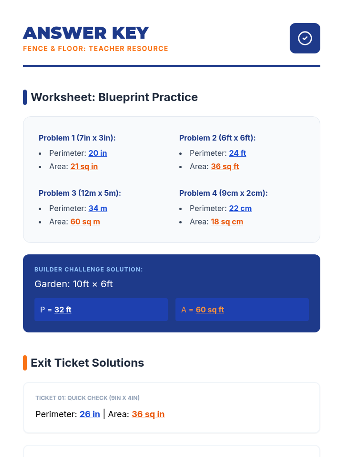 A comprehensive teacher answer key for the Fence and Floor worksheet and all three exit tickets. Provides clear calculations, final answers with correct units, and conceptual matching solutions.