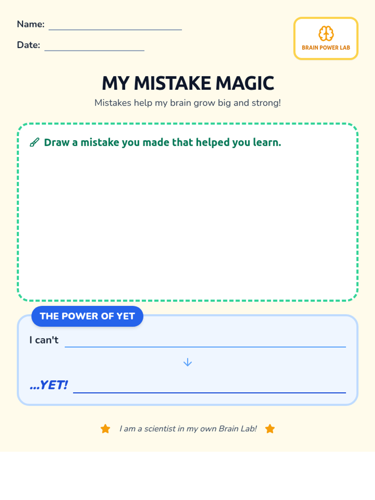 A creative student worksheet with a large drawing area for depicting a mistake and a dedicated 'Power of Yet' section for reframing challenges.