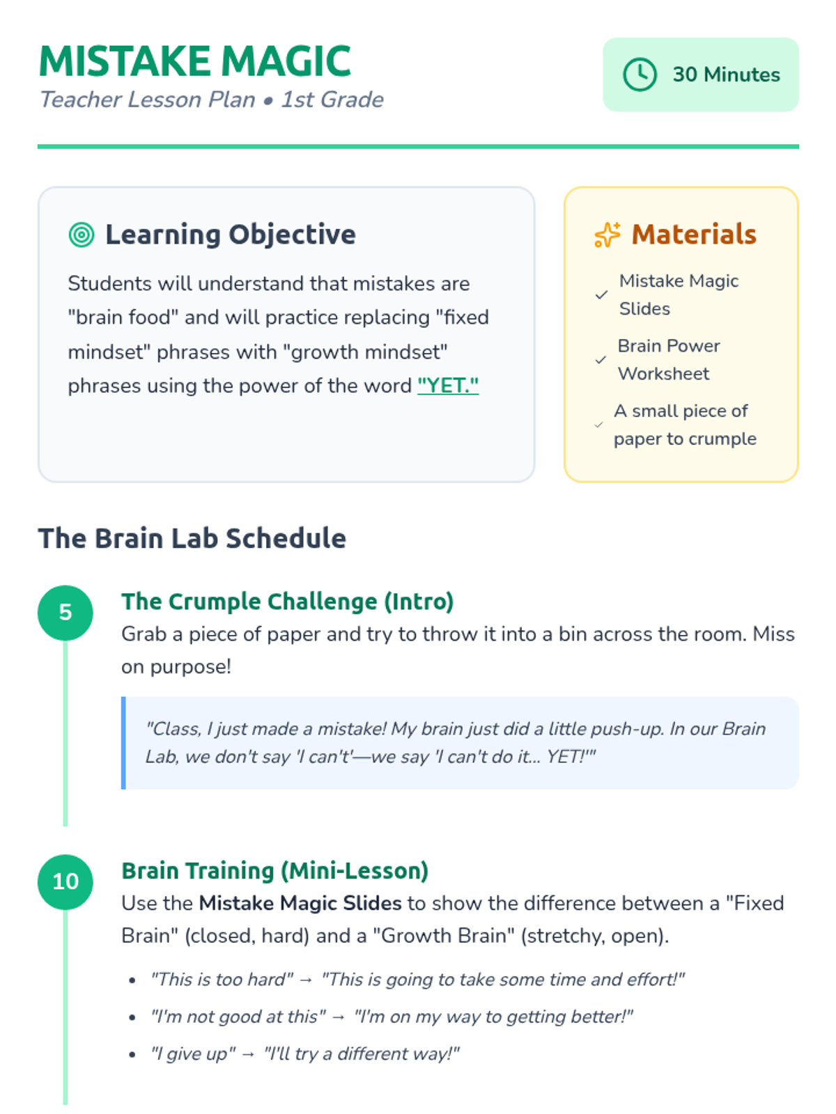 A comprehensive 30-minute lesson plan for 1st grade teachers, detailing an interactive intro activity, mini-lesson scripts, and a closing cheer focused on growth mindset.