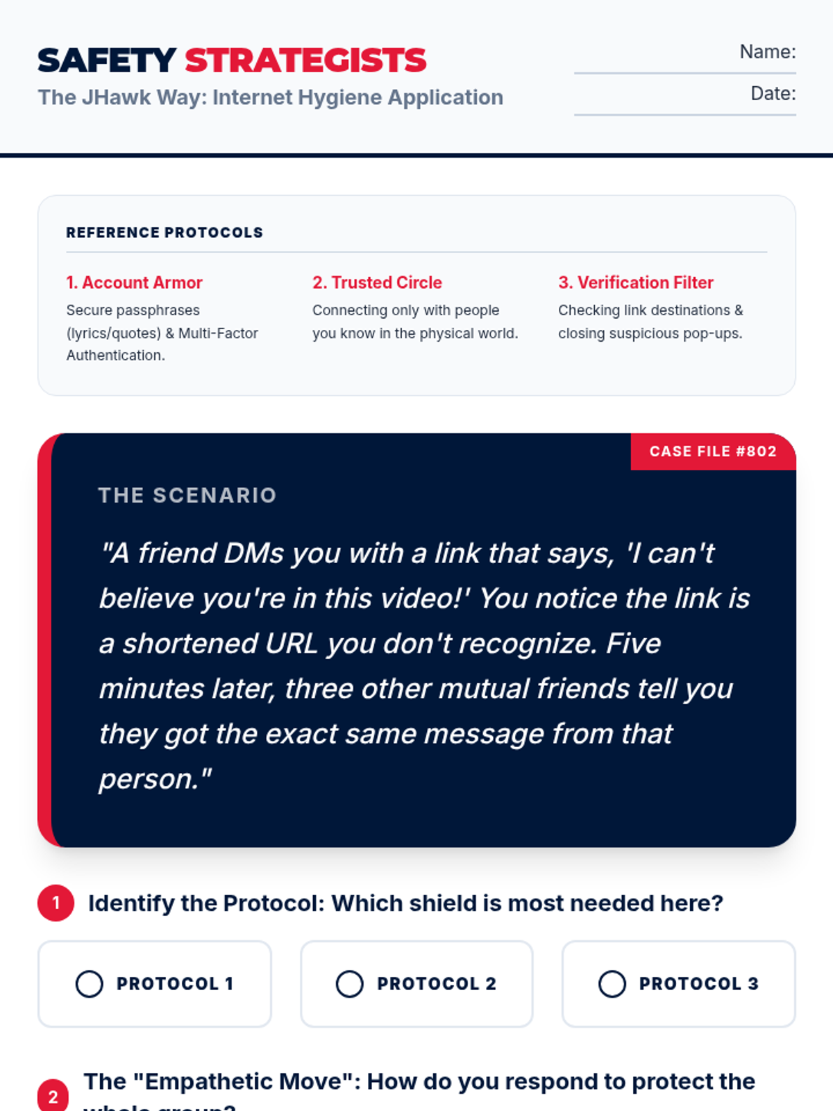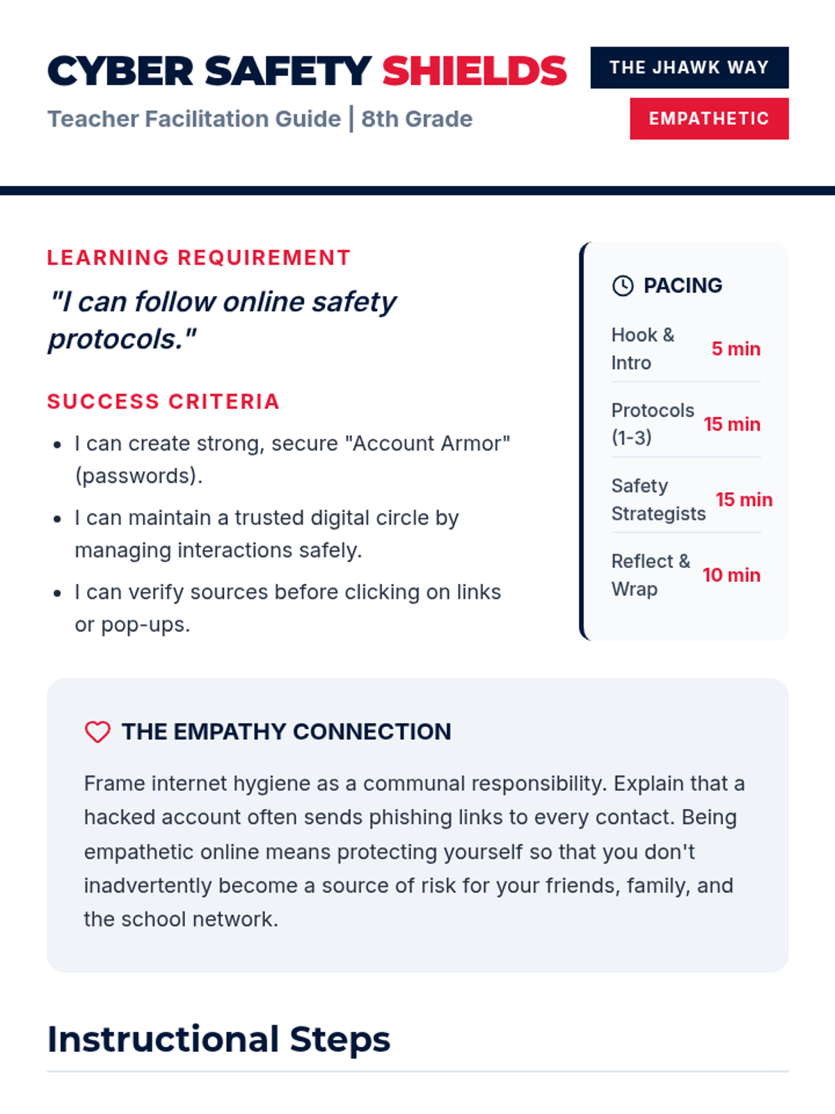 A revised teacher guide for the Cyber Safety Shields lesson, featuring fixed pacing layouts, larger protocol text for better readability, and improved footer positioning to prevent blank pages.