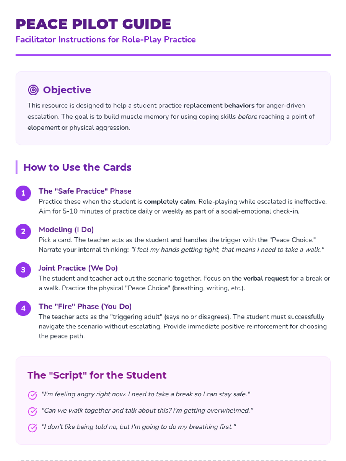 A teacher-facing guide (Peace Pilot Guide) providing instructions on how to facilitate the role-play activities. It covers different phases of practice (I Do, We Do, You Do), script suggestions for the student, and troubleshooting tips for maintaining a safe learning environment.