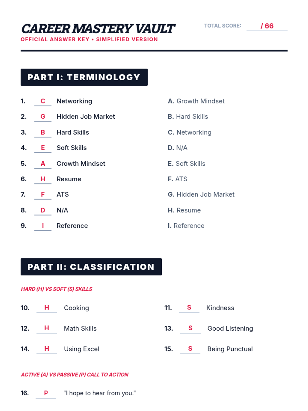 The teacher's answer key for the 80-item Simplified Career Mastery Vault Final Exam. Features red-text responses for all matching, classification, multiple choice, true/false, and analytical short responses. All numbering is aligned with the student document.