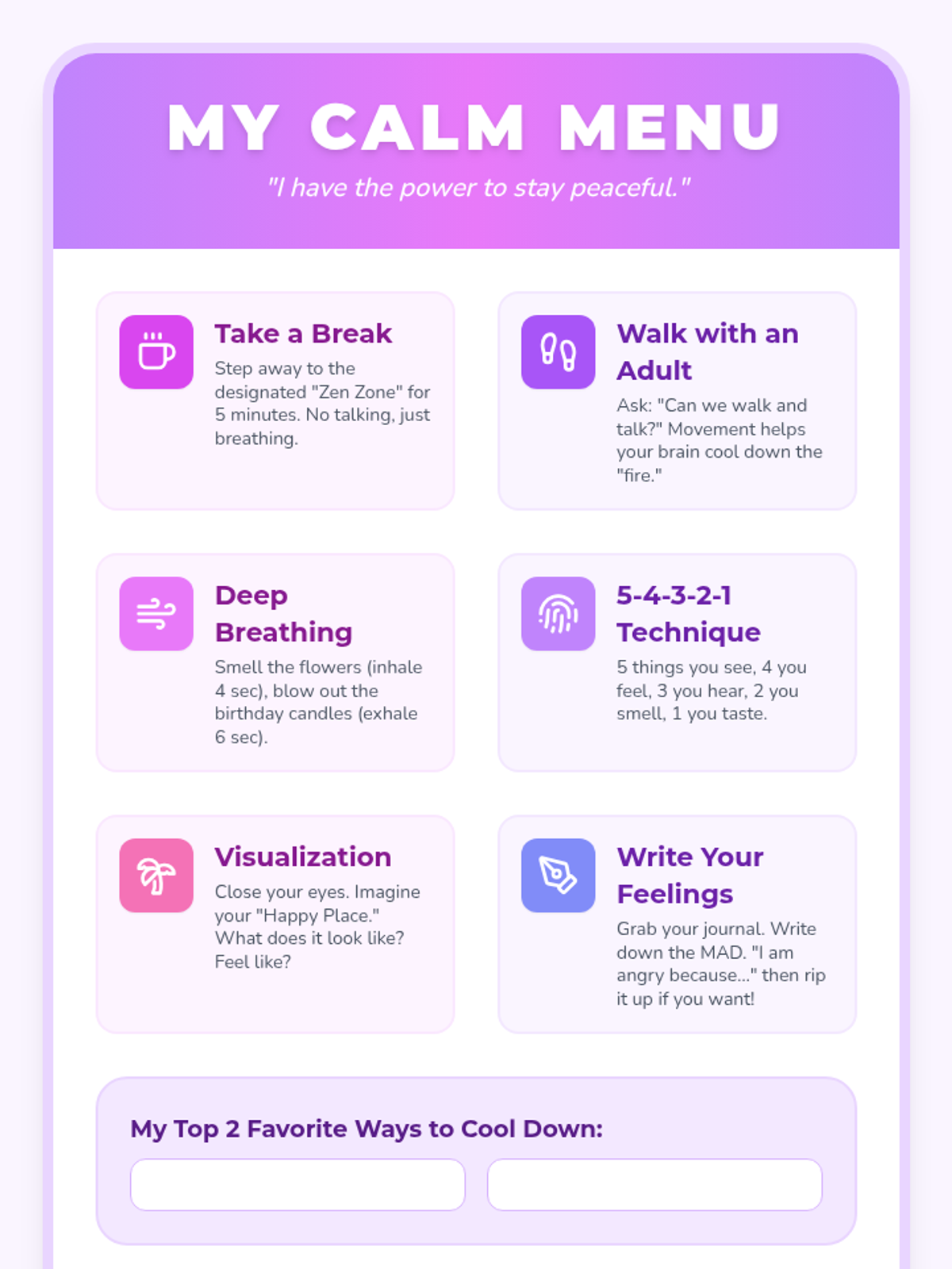 A visually engaging reference sheet (Calm Menu) for a student, listing six specific coping strategies including deep breathing, grounding, and visualization. It features a modern pink and purple aesthetic and includes a small reflection section for the student to identify their favorite techniques.