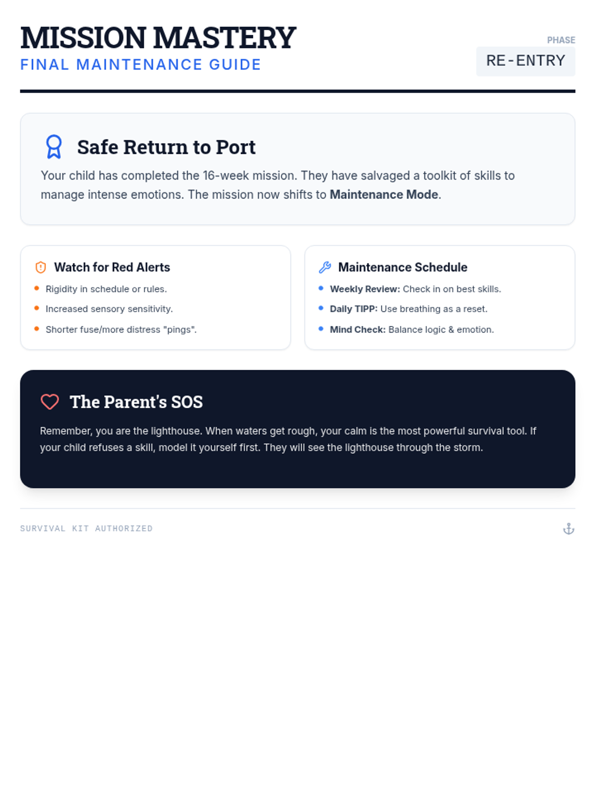 Parent guide for the final week of the Survival and Salvage DBT program, focusing on post-program maintenance and identifying early warning signs for skill reinforcement. Revised to fit a single page.