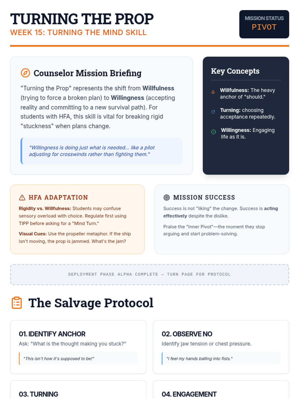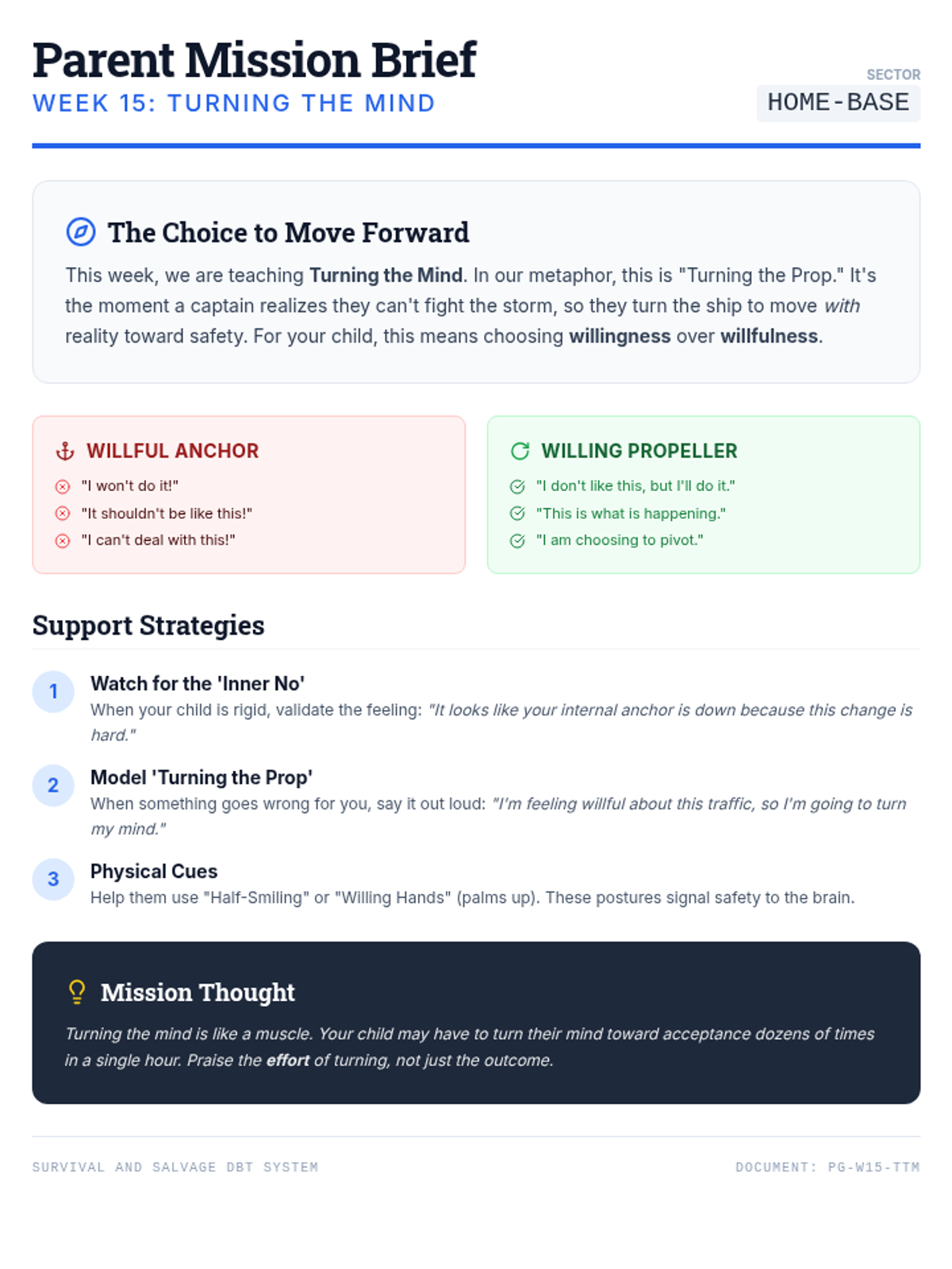 Parent guide for Week 15 of the Survival and Salvage DBT program, explaining the Turning the Mind skill using the 'Turning the Prop' metaphor for autism-friendly communication at home. Revised to fit a single page.