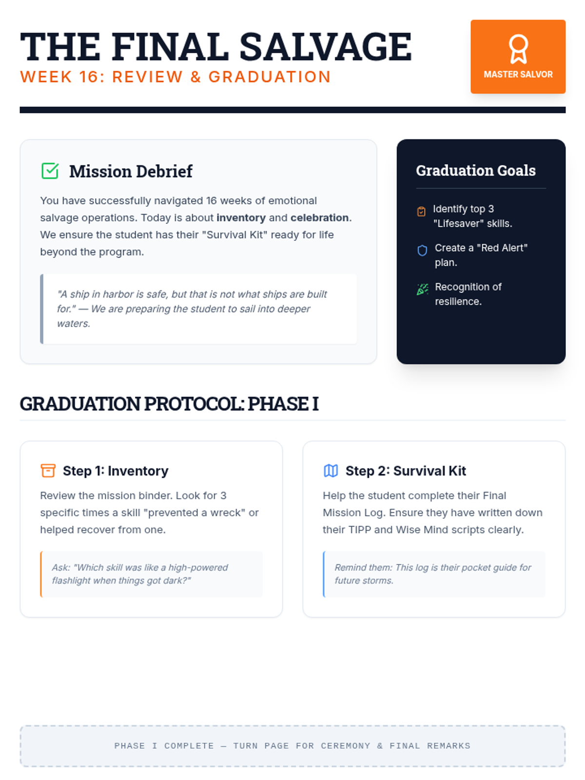 Counselor guide for the final week of the Survival and Salvage DBT program, covering the review of skills, graduation ceremony protocols, and maintenance planning. Revised to fix protocol splitting and layout issues.