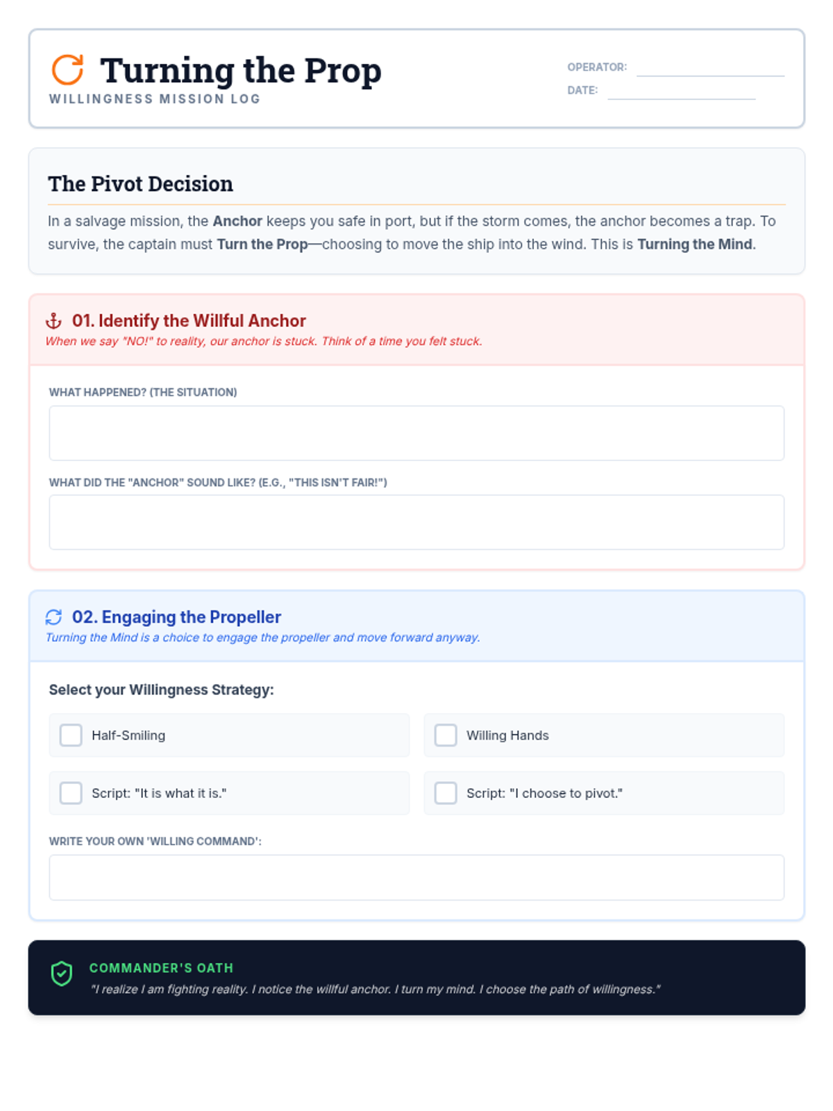 A student-facing worksheet for practicing the Turning the Mind skill using the 'Turning the Prop' metaphor. Includes identification of the 'Willful Anchor' and selection of 'Willingness Strategies'. Revised for single-page layout and white writing areas.