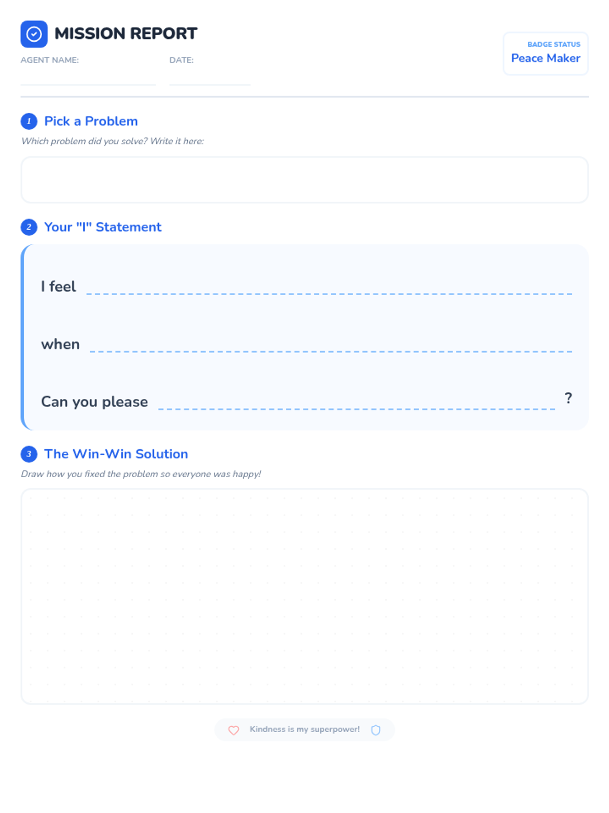 An independent reflection worksheet where students write an "I" statement and illustrate a win-win solution for a chosen conflict scenario. Improved line spacing for 2nd grade.