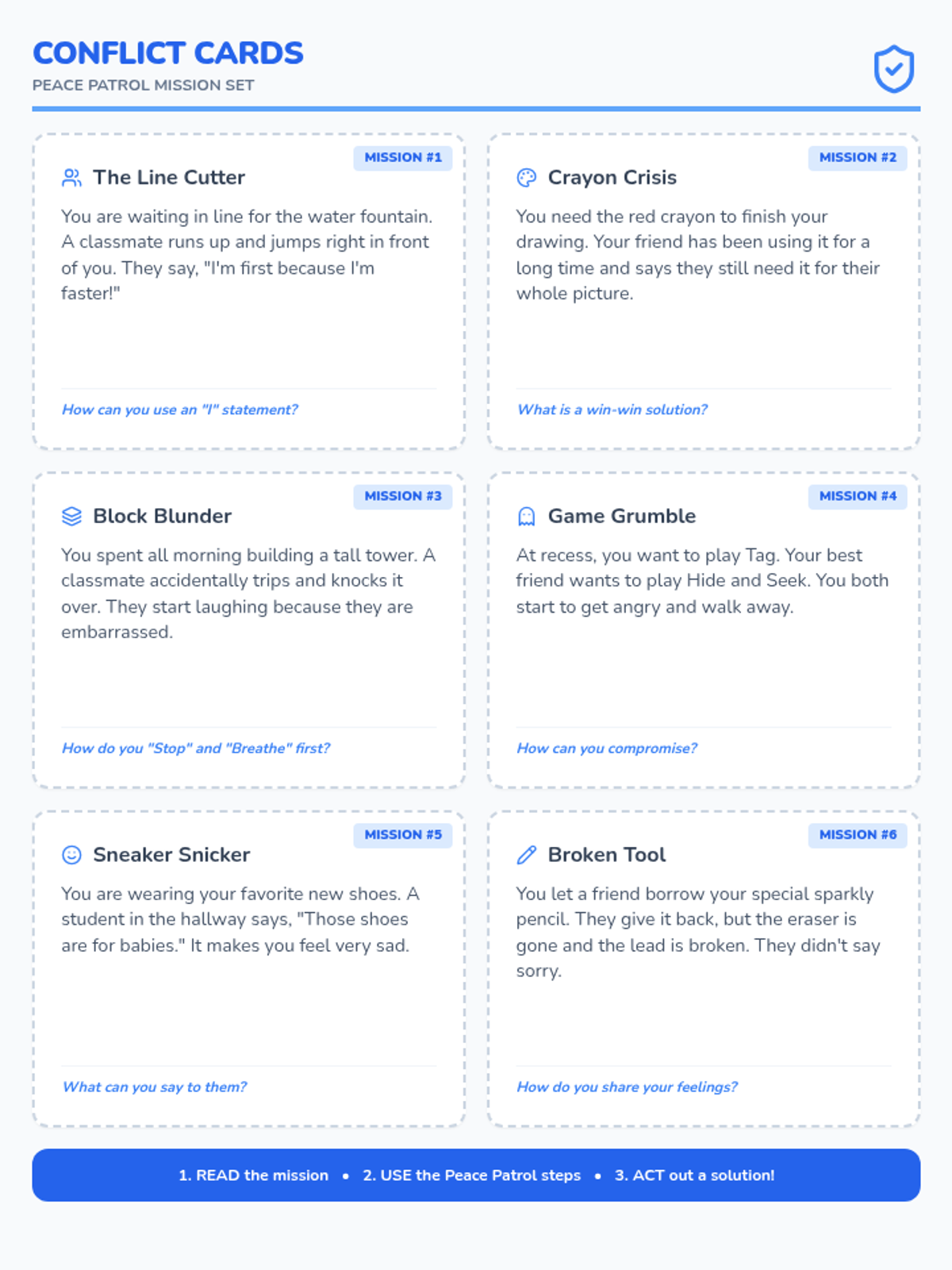 A set of printable discussion cards featuring six relatable school-based conflict scenarios for small group problem-solving practice. Polished to fit on one page.