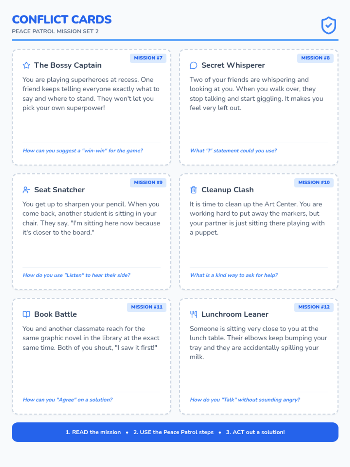 A second set of printable conflict cards (Missions 7-12) featuring school-based scenarios like bossiness, seat-taking, and library disagreements for 2nd grade practice.