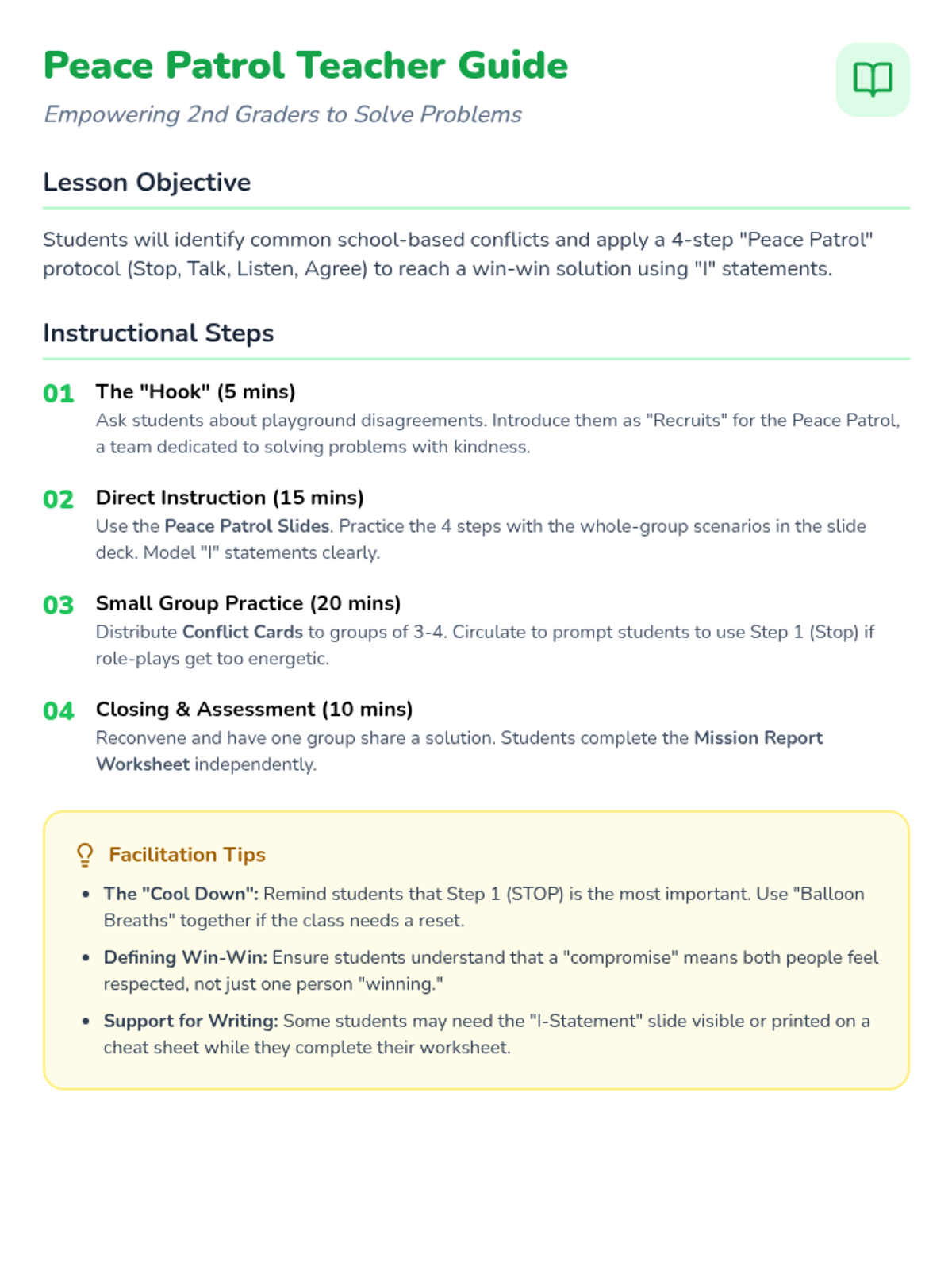 A comprehensive teacher guide for facilitating the "Peace Patrol" lesson, including pacing, instructional steps, and tips for managing classroom discussions. Refined to fit on one page.