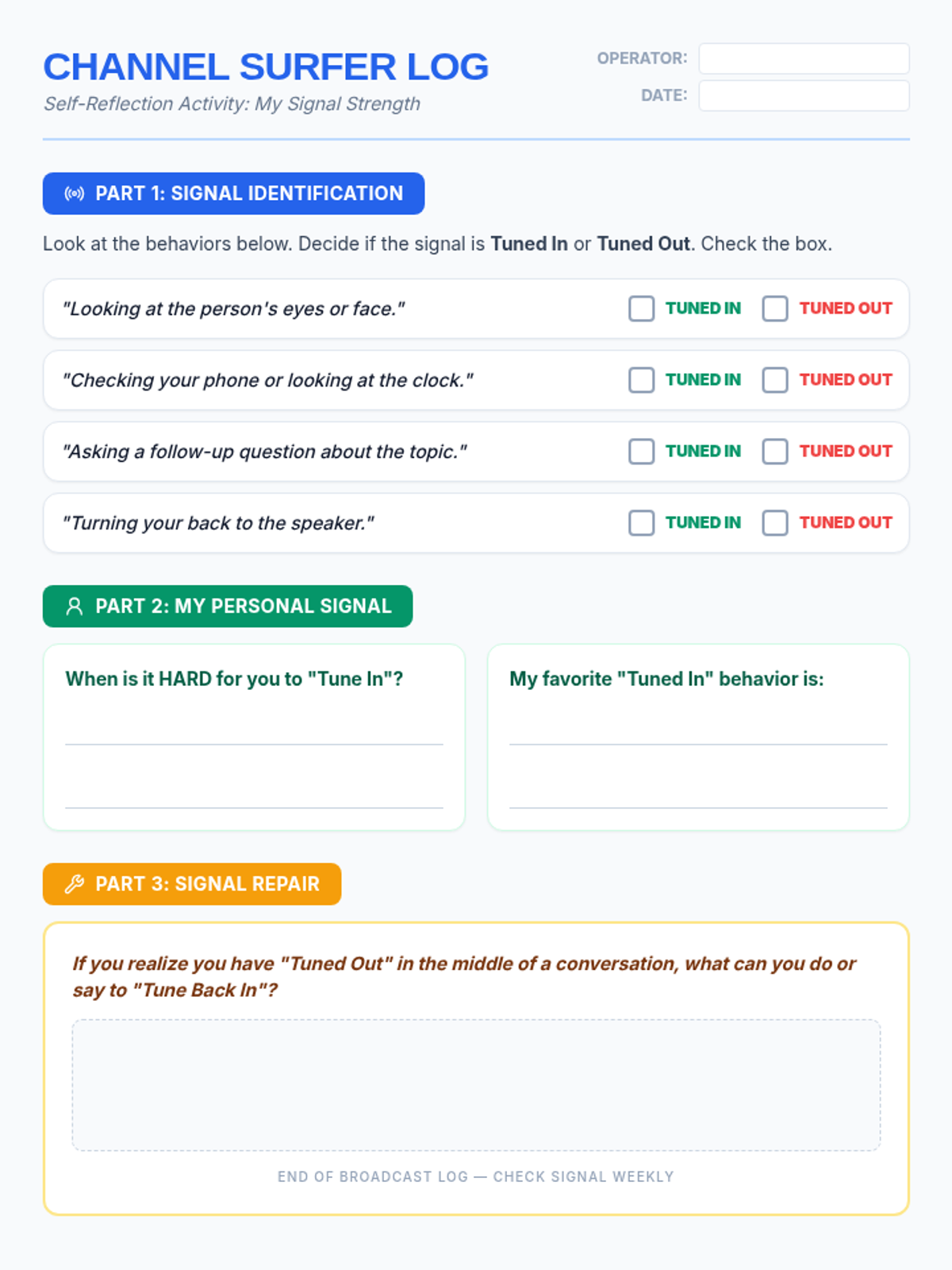 A student worksheet for identifying 'tuned in' and 'tuned out' behaviors and reflecting on personal communication habits.