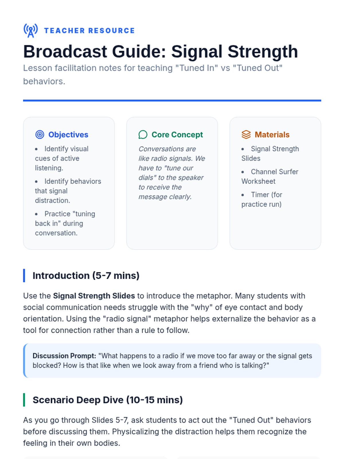 Teacher facilitation guide for the 'Signal Strength' social skills lesson, including discussion prompts, differentiation strategies, and extension activities.