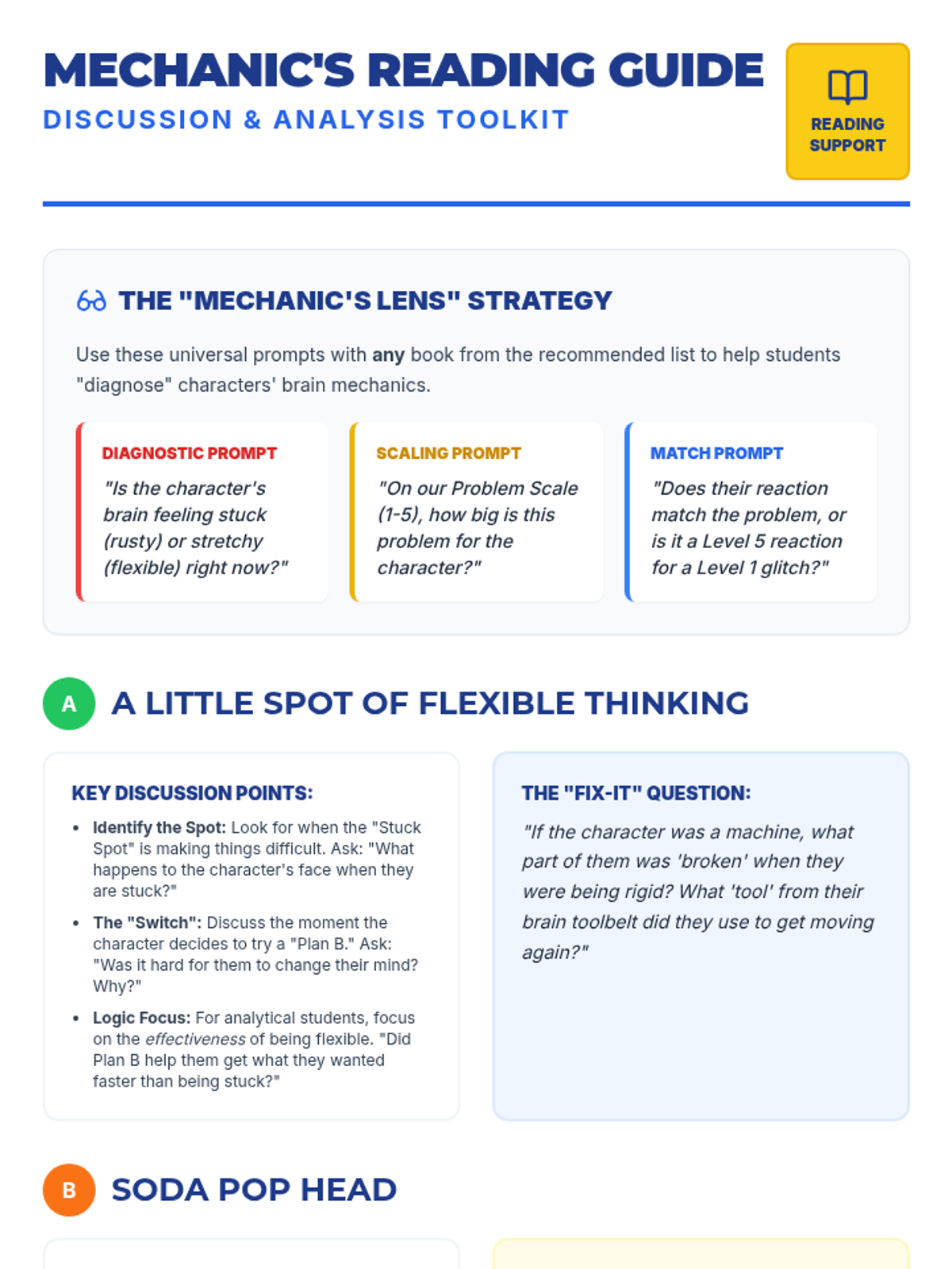 A teacher-facing reading guide for the 'Brain Mechanics' lesson, providing discussion prompts and analysis strategies for recommended books like 'A Little Spot of Flexible Thinking' and 'Soda Pop Head'.