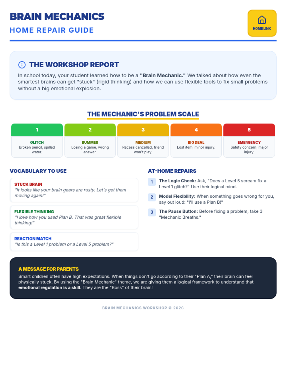 A parent handout for the 'Brain Mechanics' lesson, summarizing key vocabulary, the 1-5 problem scale, and at-home reinforcement strategies for managing stuck thinking and emotional regulation.