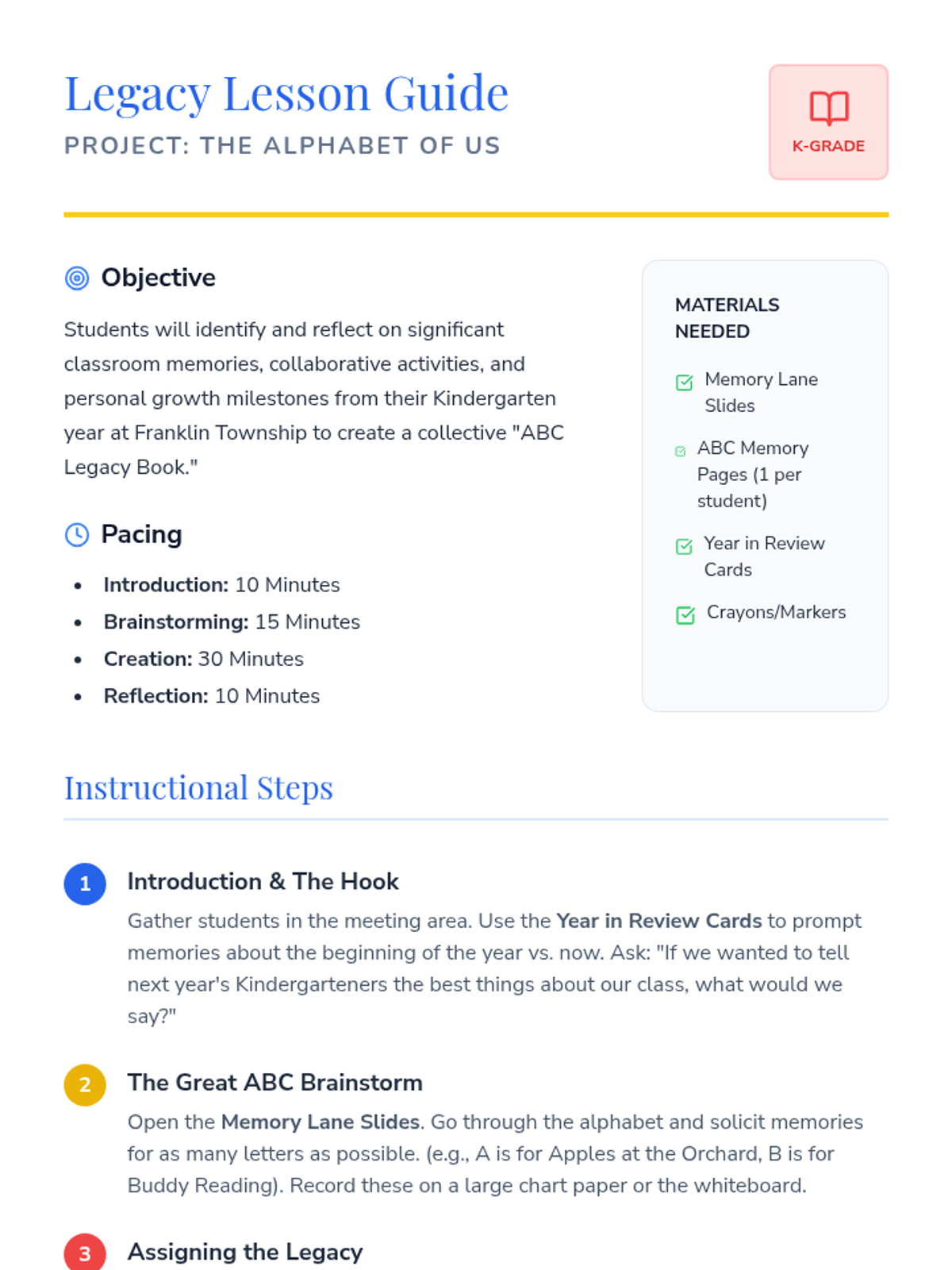 A comprehensive teacher's guide for the 'Memory Makers' lesson, outlining objectives, pacing, and step-by-step instructions for creating a classroom ABC book. Revised for page flow and clarity.
