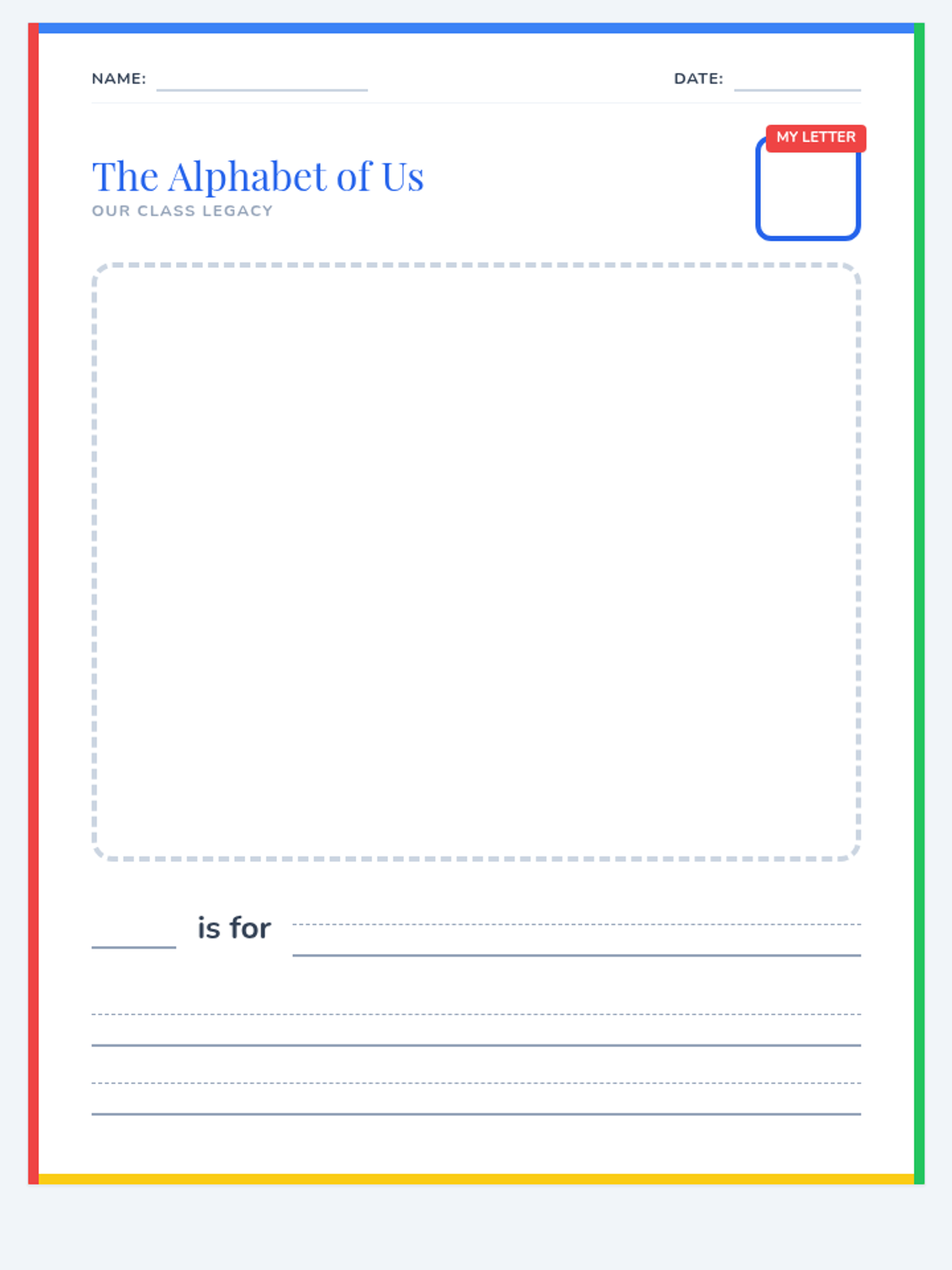 A printable page for students to illustrate a classroom memory and complete a sentence. Features adjusted layout to fit one page and Kindergarten-appropriate writing lines with dashed midlines. Revised for visibility and cleaner layout.