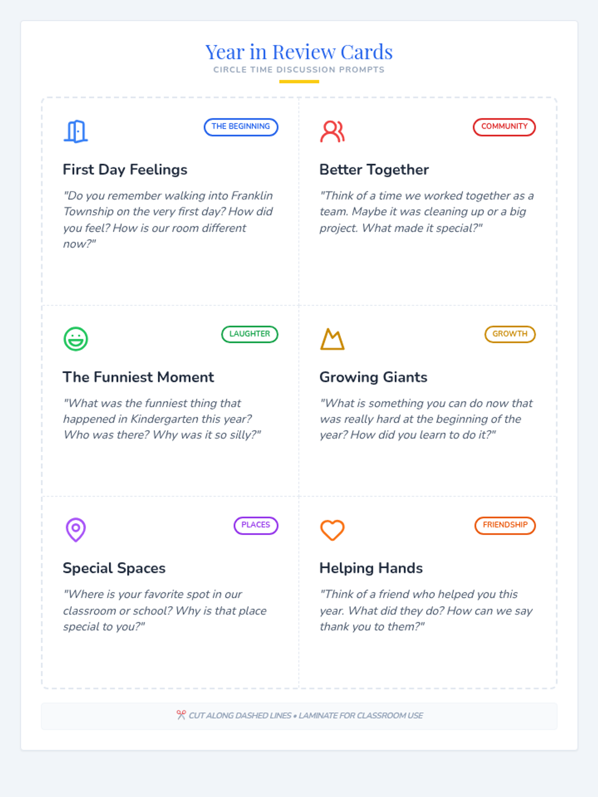 A set of six printable discussion prompt cards designed to facilitate reflective circle time conversations about the school year. Revised for ink-efficiency and single-page layout with visible cut lines.
