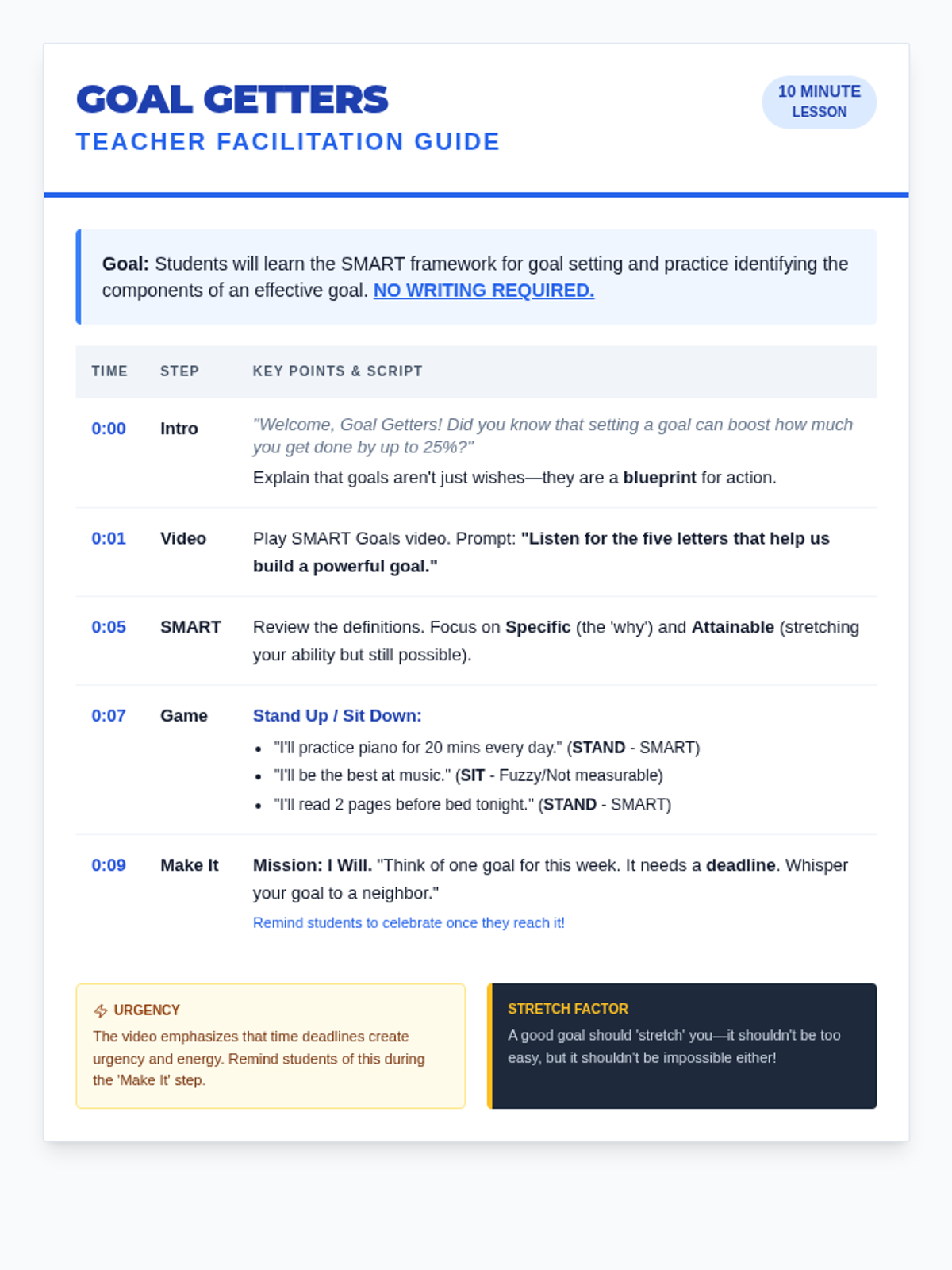 A concise teacher facilitation guide for a 10-minute lesson on growth mindset and SMART goals, featuring a timed instructional flow and interactive prompts.