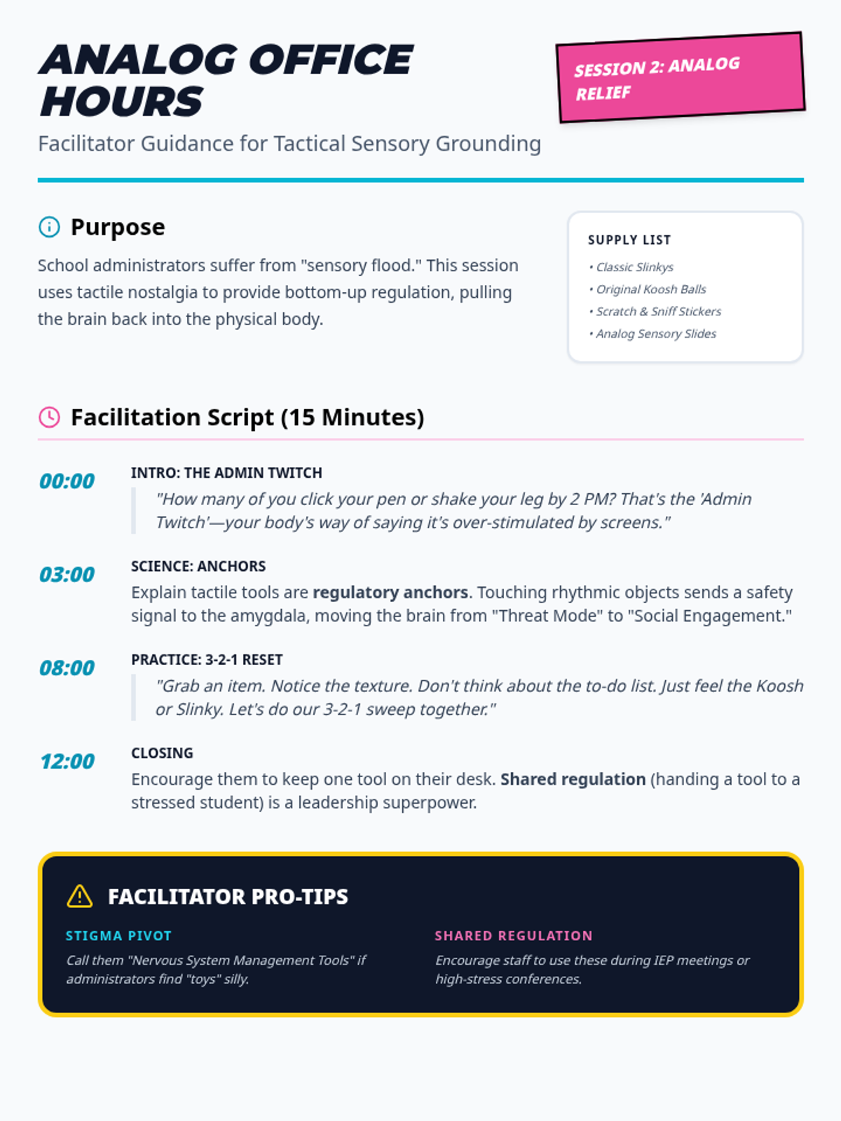 A facilitator guide for the 'Analog Office Hours' session, providing clinical context for sensory grounding and a step-by-step facilitation script for school counselors.