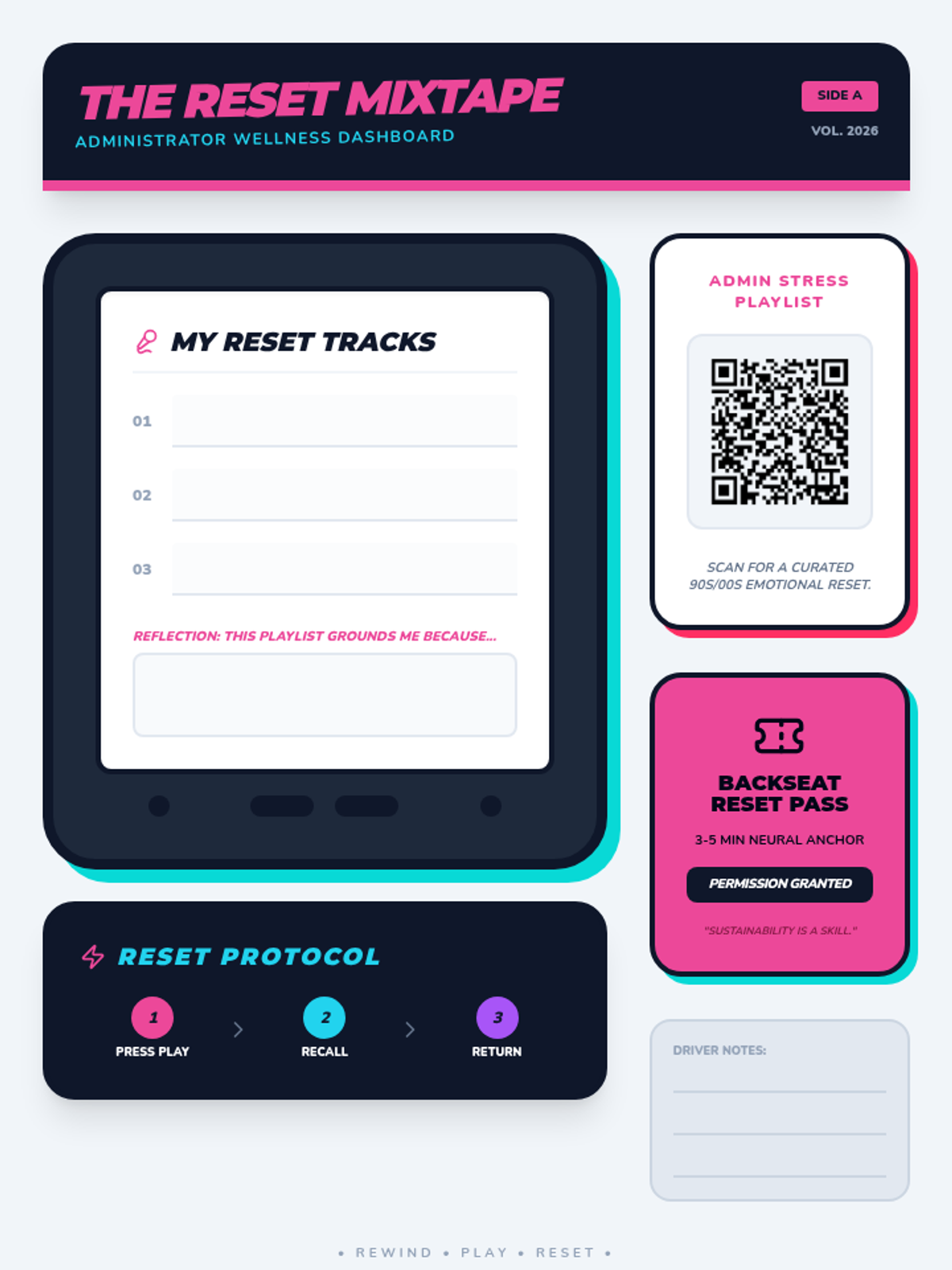 A printable dashboard toolkit for principals featuring a cassette-tape-inspired playlist card, a Spotify QR code for the 'Admin Stress Playlist', nostalgia reflection prompts, and a symbolic 'Backseat Reset Pass'.
