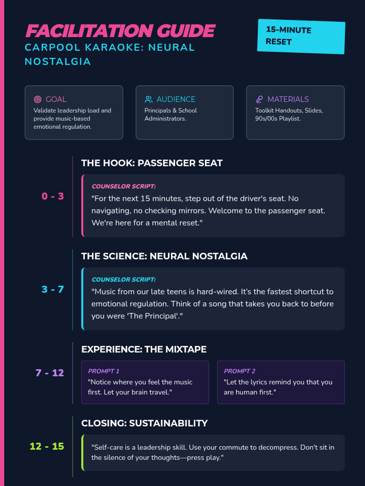 A comprehensive counselor facilitation guide for the Neural Nostalgia wellness session, including a scripted timeline, the science of music-based regulation, and a curated 90s/00s playlist catalog.