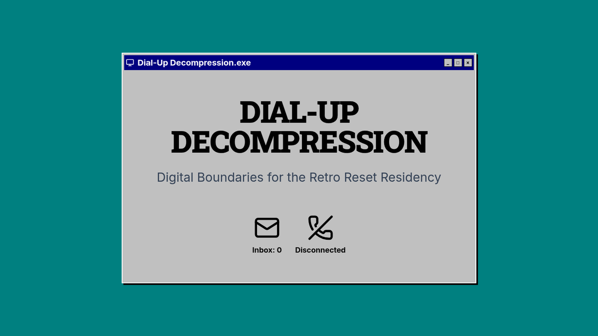 A 6-slide presentation for the 'Dial-Up Decompression' session. Features a nostalgic Windows 95/98 aesthetic, focusing on digital boundaries, the cost of connectivity, and analog connection rituals.