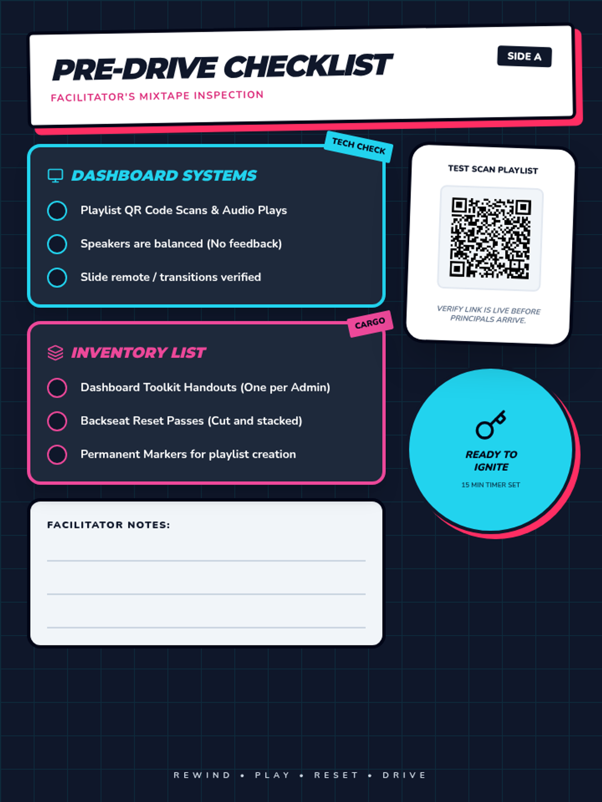 A facilitator's prep checklist for the Neural Nostalgia session, featuring tech verification, material organization, and environmental setup steps in a 90s retro mixtape aesthetic. Includes the Spotify QR code for testing.