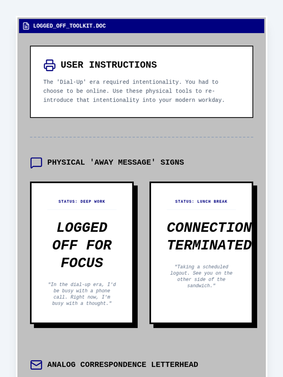 A printable toolkit for 'Dial-Up Decompression' featuring physical 'Away Message' desk signs and branded letterhead for the 'Slow Mail' connection activity.