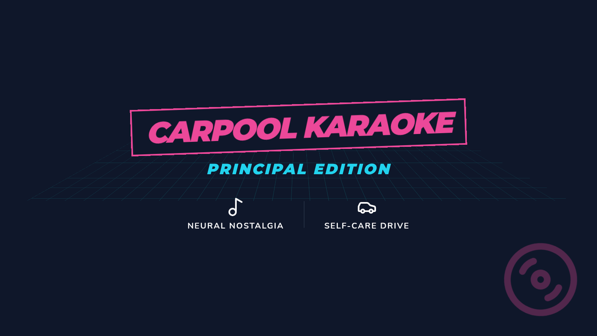 A 6-slide visual presentation for the 'Carpool Karaoke' wellness session. Features a 90s neon mixtape aesthetic, the 'Admin Stress' playlist QR code, and the 3-step reset protocol.