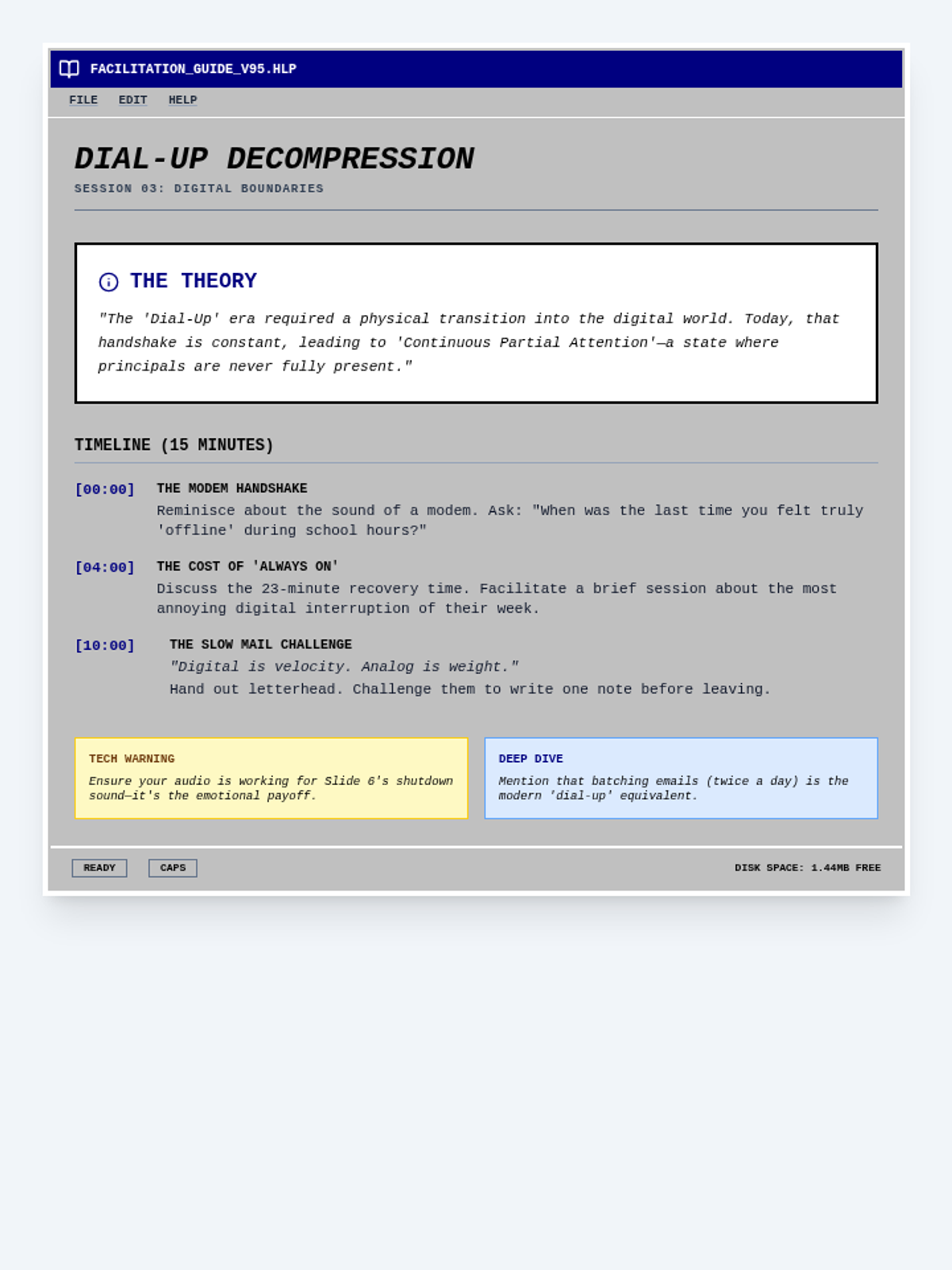 A counselor facilitation guide for the 'Dial-Up Decompression' session, featuring a scripted timeline and clinical context for digital boundary setting in a Windows 95 aesthetic.