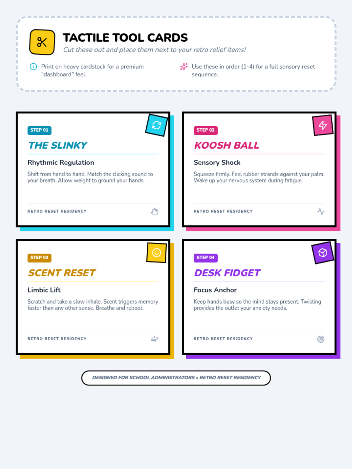 Printable cards to be placed next to retro sensory items in an office or sensory station, providing instructions and clinical context for each grounding tool.